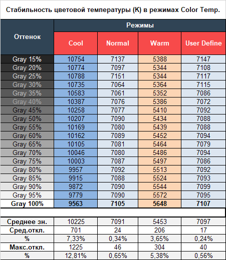 Теперь рассмотрим результаты специальных режимов Color Temperature. Напомним, что по умолчанию производитель установил пресет “Normal”, но для дальнейшего тестирования мы переключились в режим Custom и выставили Gamma 2.4, а поэтому значения ЦТ немного изменились: