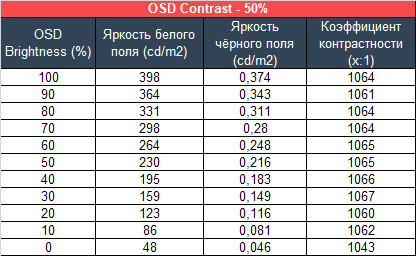 Для изучения стабильности контрастности и диапазона изменения яркости был выставлен стандартный режим. Значение Brightness менялось с 100 до 0% с шагом в 10 единиц. Для представленной ниже таблицы измеренные значения были получены через программу HCFR, которая даёт возможность более точно оценить уровень чёрного (три знака после запятой) и соответственно определить достоверный коэффициент контрастности.
