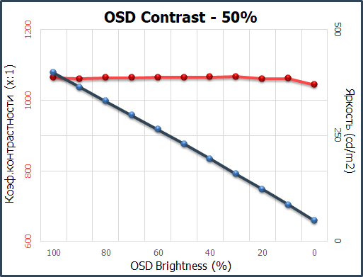 При стандартных установках полученный рабочий диапазон яркости составил 48-398 нит при среднем коэффициенте контрастности в ~1060:1. Снижение яркости линейно, а коэффициент контрастности стабилен во всём диапазоне и чуть выше заявленного производителем уровня.
