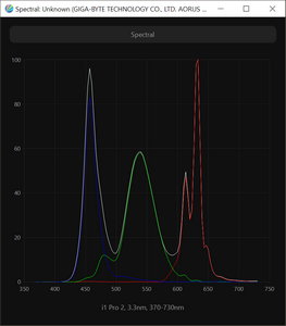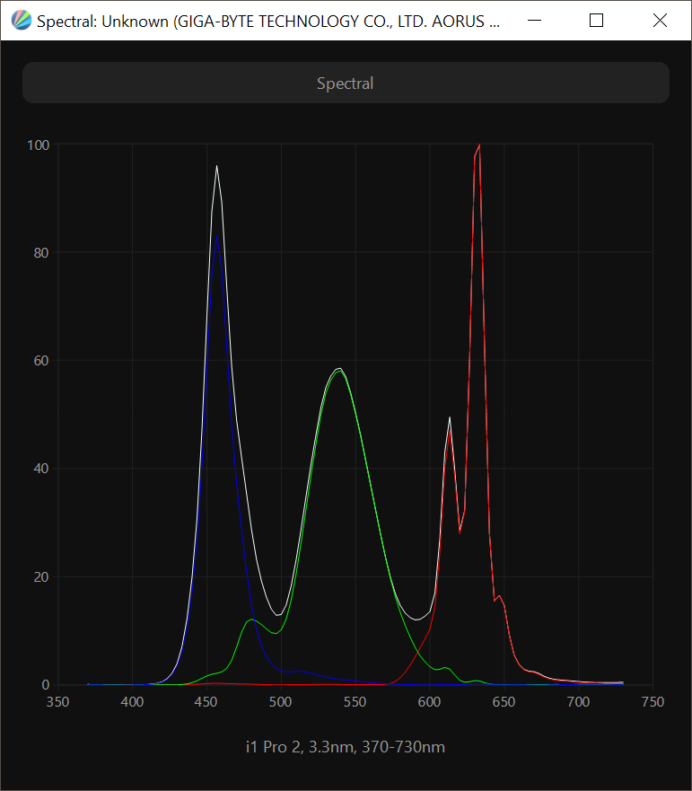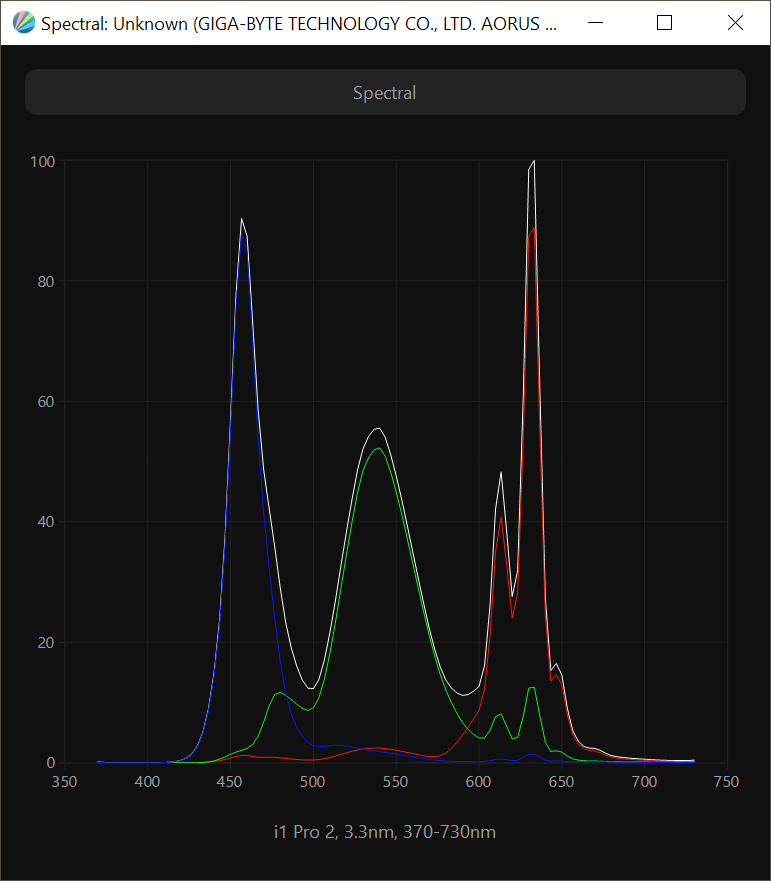 Говоря о возможностях цветовоспроизведения, производитель говорит о 123 % sRGB и 90 % DCI-P3, а полученный спектр подсветки лишь подтверждает использование продвинутой схемы подсветки. Впрочем, не всё настолько очевидно…