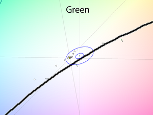 Построенная диаграмма совсем не напоминает таковую по равномерности подсветки – фигура здесь совсем иная. Цветовая температура плавно уменьшается от центра к краям экрана и особенно это заметно по левой части дисплея. В реальной работе это может сказываться некоторым дискомфортом, если большую часть экрана занимают светлые однотонные заливки (веб-сёрфинг, работа с документами), но точно не будет беспокоить вас в играх или при работе с фото и видео.