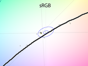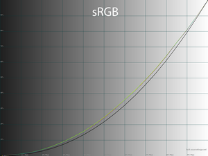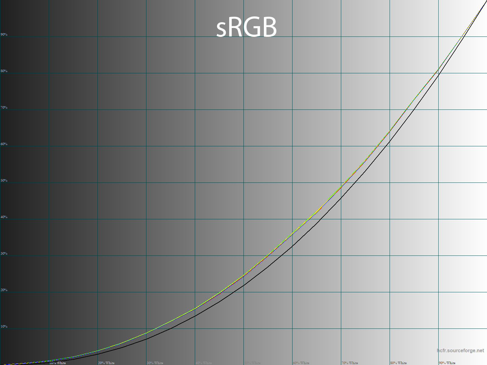 В режиме эмуляции sRGB проведена грамотная настройка цветового пространства, но, увы, на всем остальном производитель не сделал большого акцента. Контрастность ниже, чем должна быть по стандарту sRGB, а точка белого всё ещё находится в зоне DeltaE<10 на пару со всеми остальными оттенками серого.