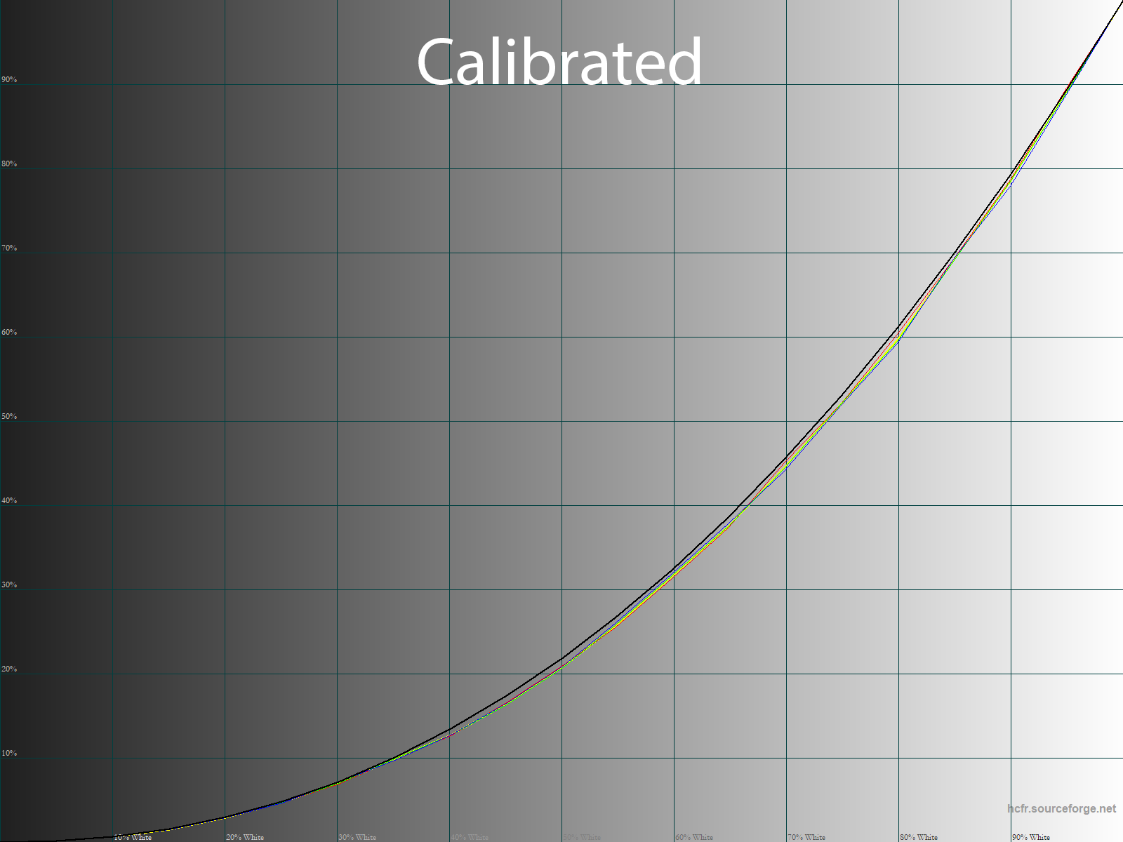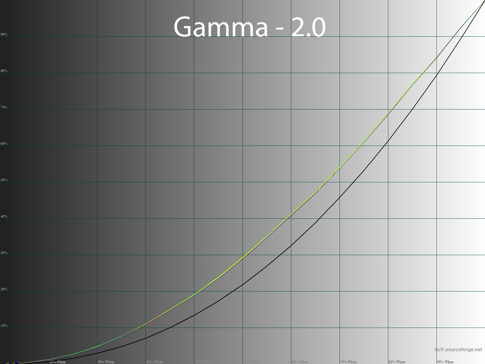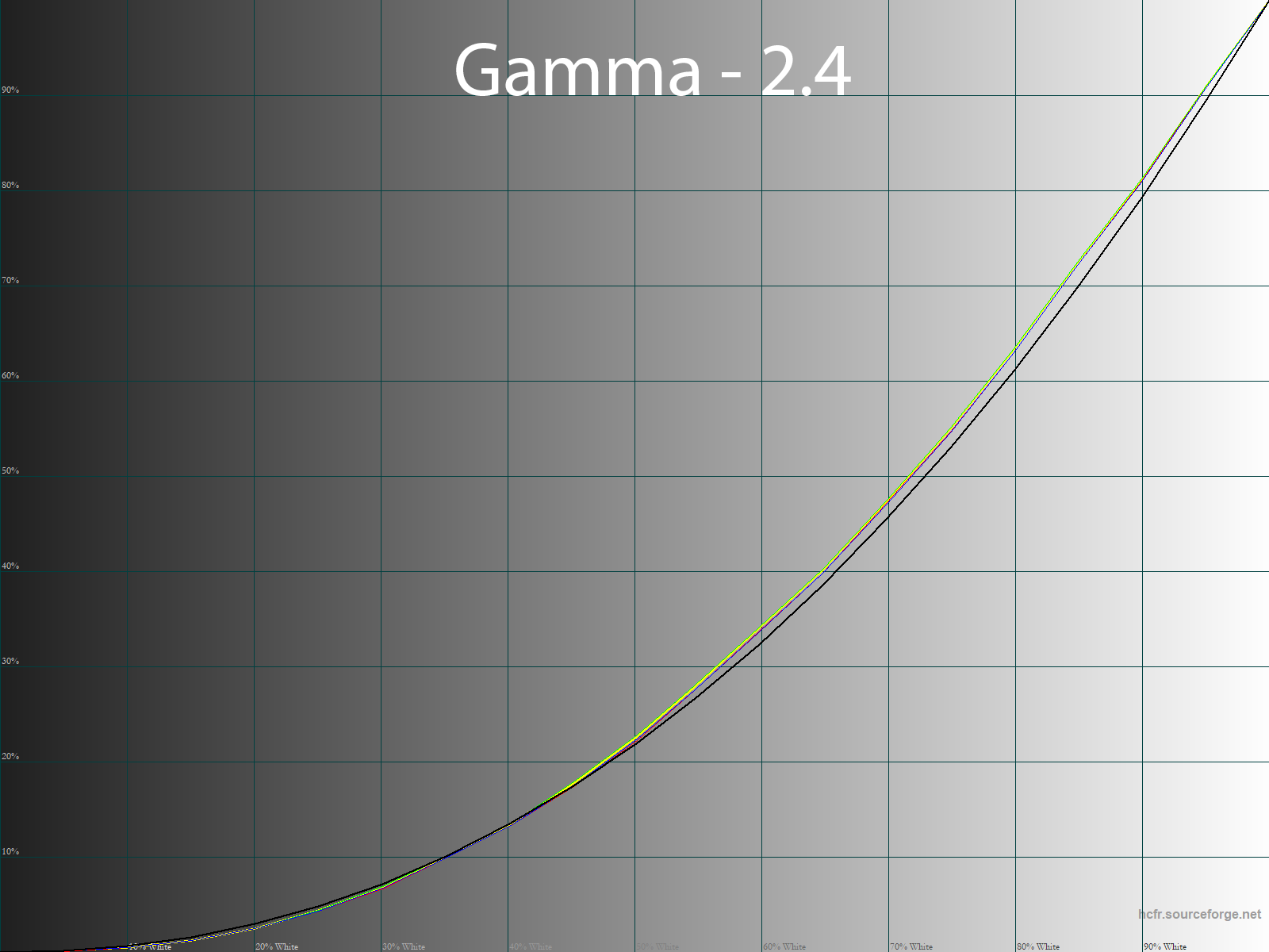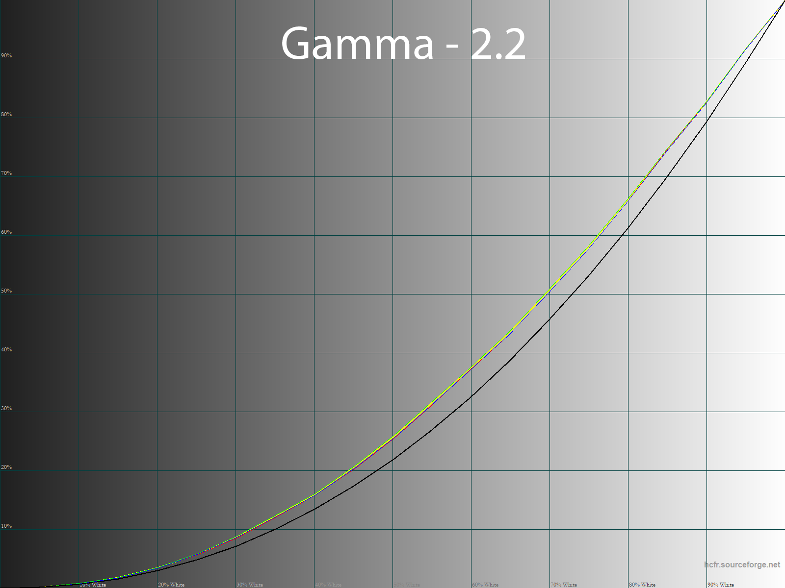 Лишь после череды ручных настроек с подбором наиболее корректных параметров и дальнейшей калибровки монитор смог показать нам хороший результат. Коэффициент контрастности немного снизился, но сохранился на заявленном уровне. Точка белого выставилась в нейтральной зоне без паразитного оттенка, а гамма слегка выше референса из-за не самой высокой стабильности цветопередачи в ходе прогрева монитора.