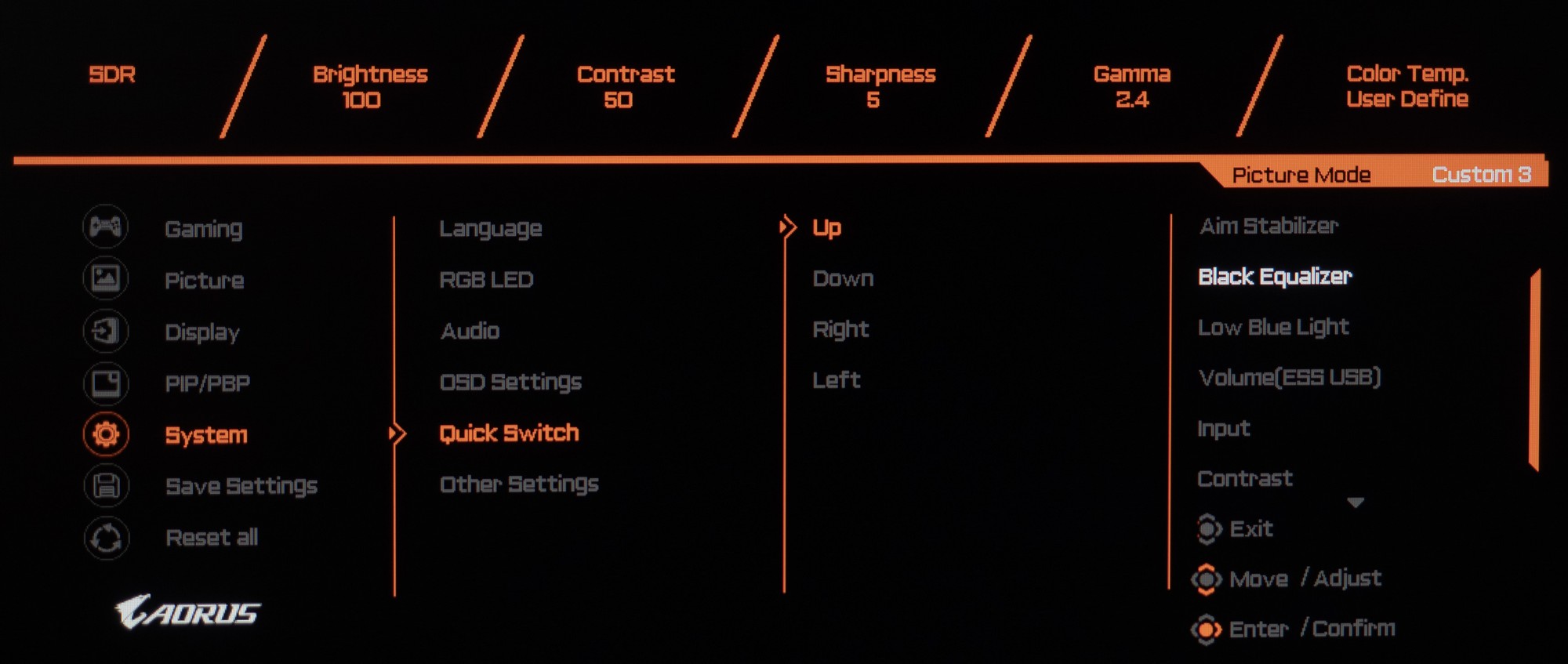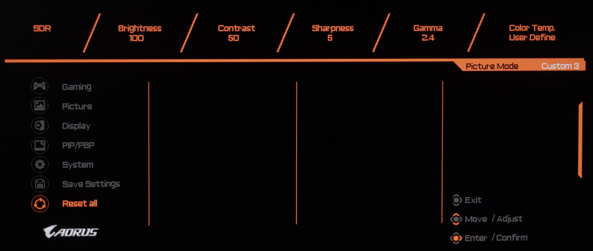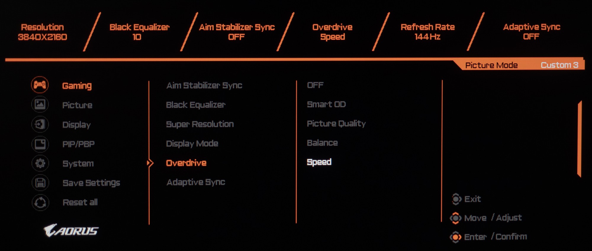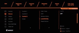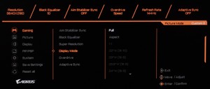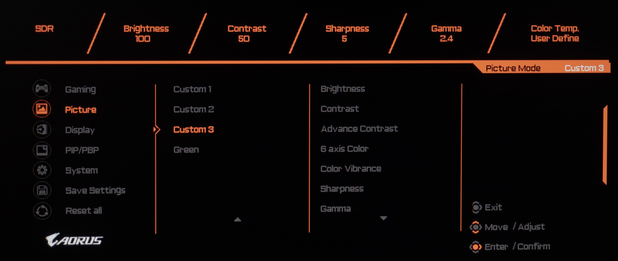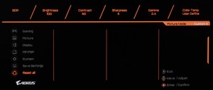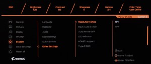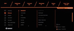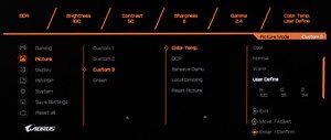 В новинке от Gigabyte предустановлено восемь основных режимов (учитывая AIM Stabilizer Sync), практически каждый из которых может быть подвержен дополнительной настройке на том или ином уровне, а также три Custom пресета, с помощью которых пользователь может создать свой «собственный мир красок» и «правильных визуальных ощущений».