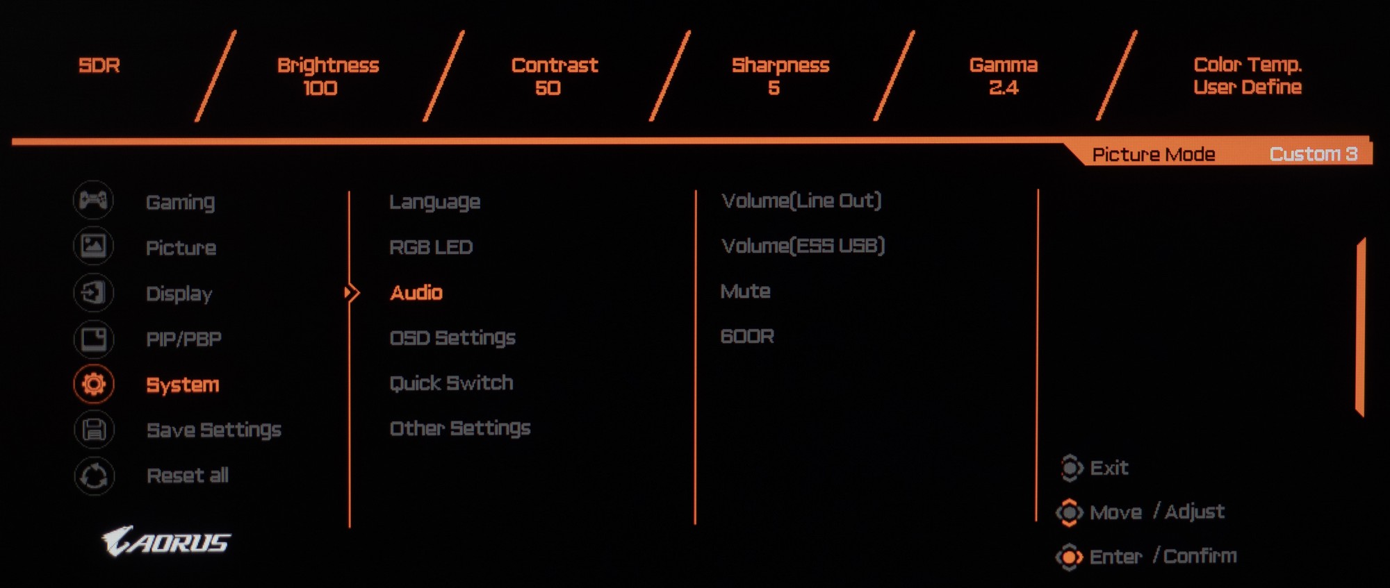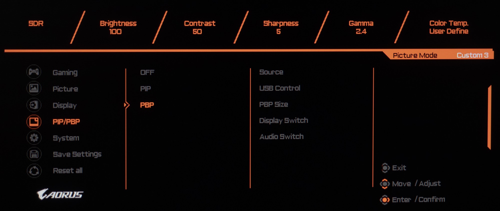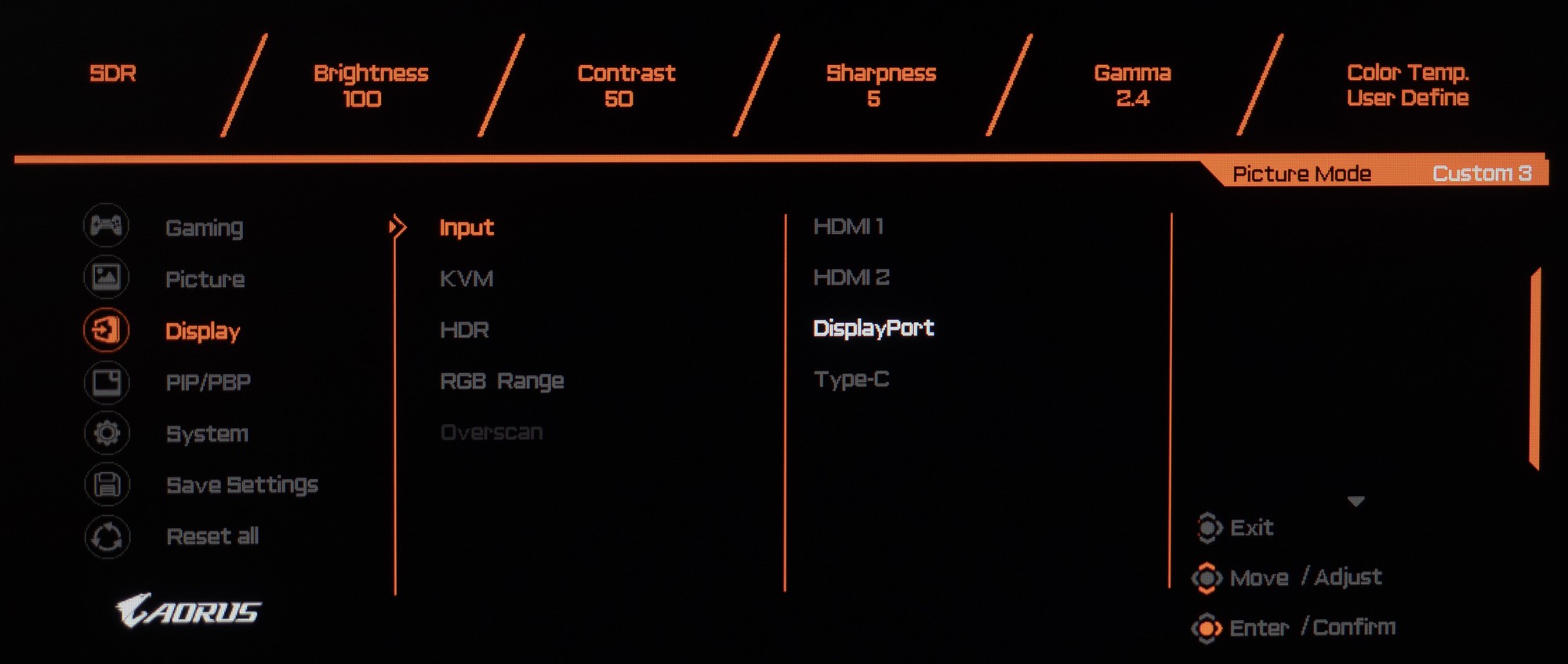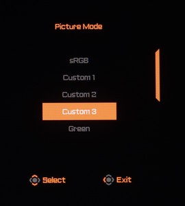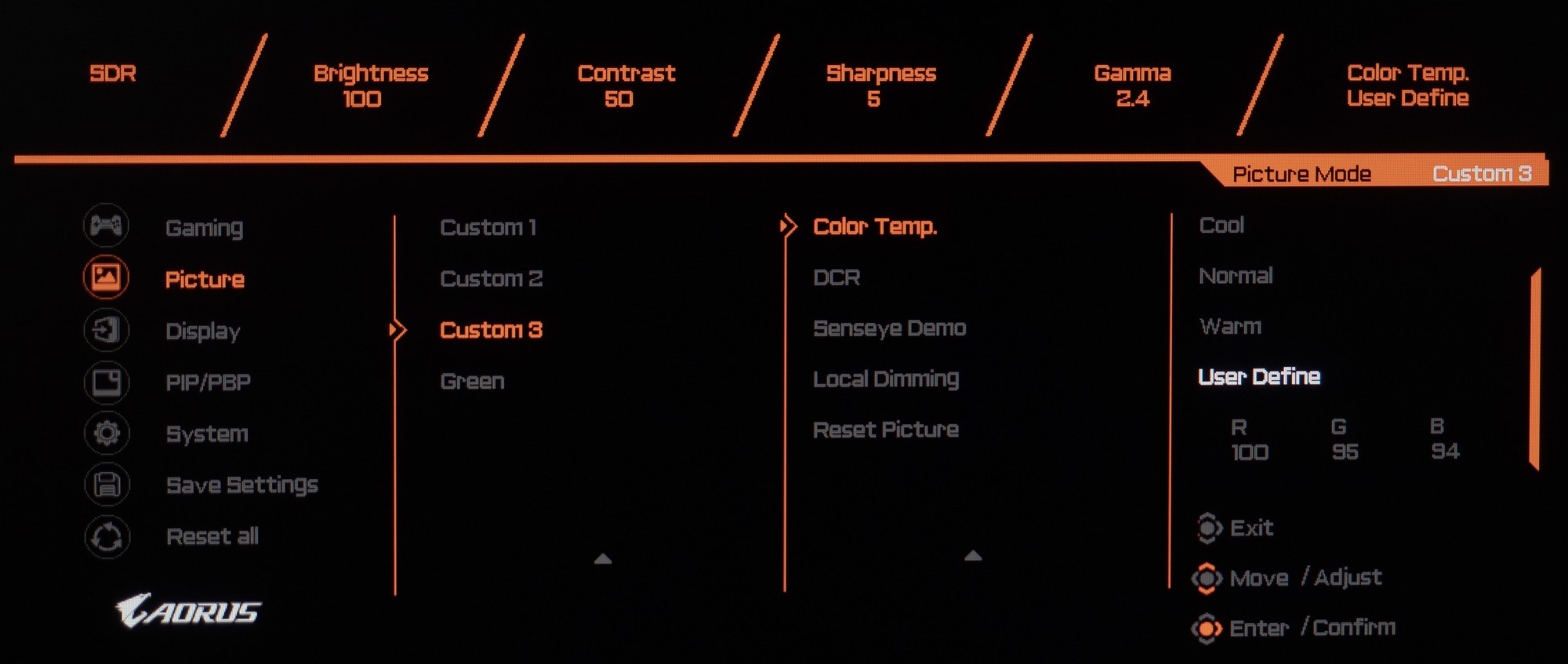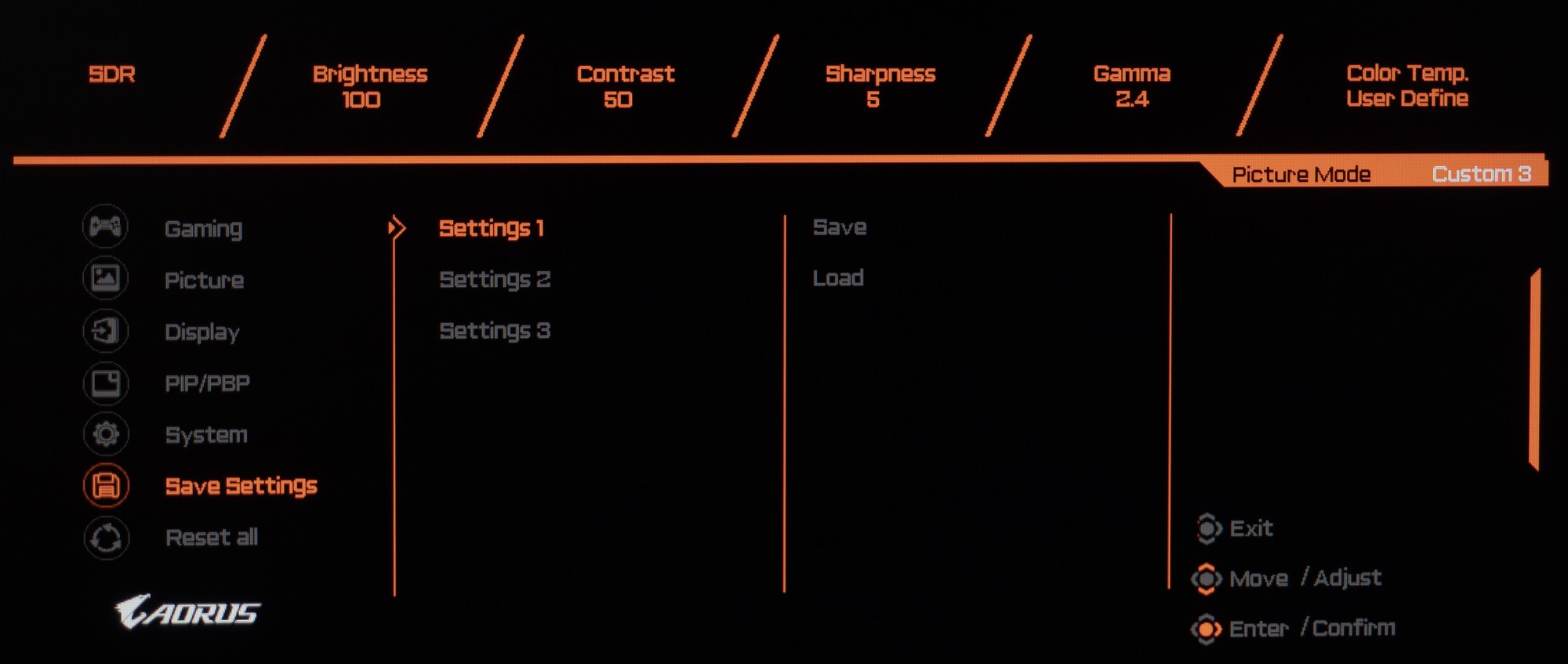 В новинке от Gigabyte предустановлено восемь основных режимов (учитывая AIM Stabilizer Sync), практически каждый из которых может быть подвержен дополнительной настройке на том или ином уровне, а также три Custom пресета, с помощью которых пользователь может создать свой «собственный мир красок» и «правильных визуальных ощущений».