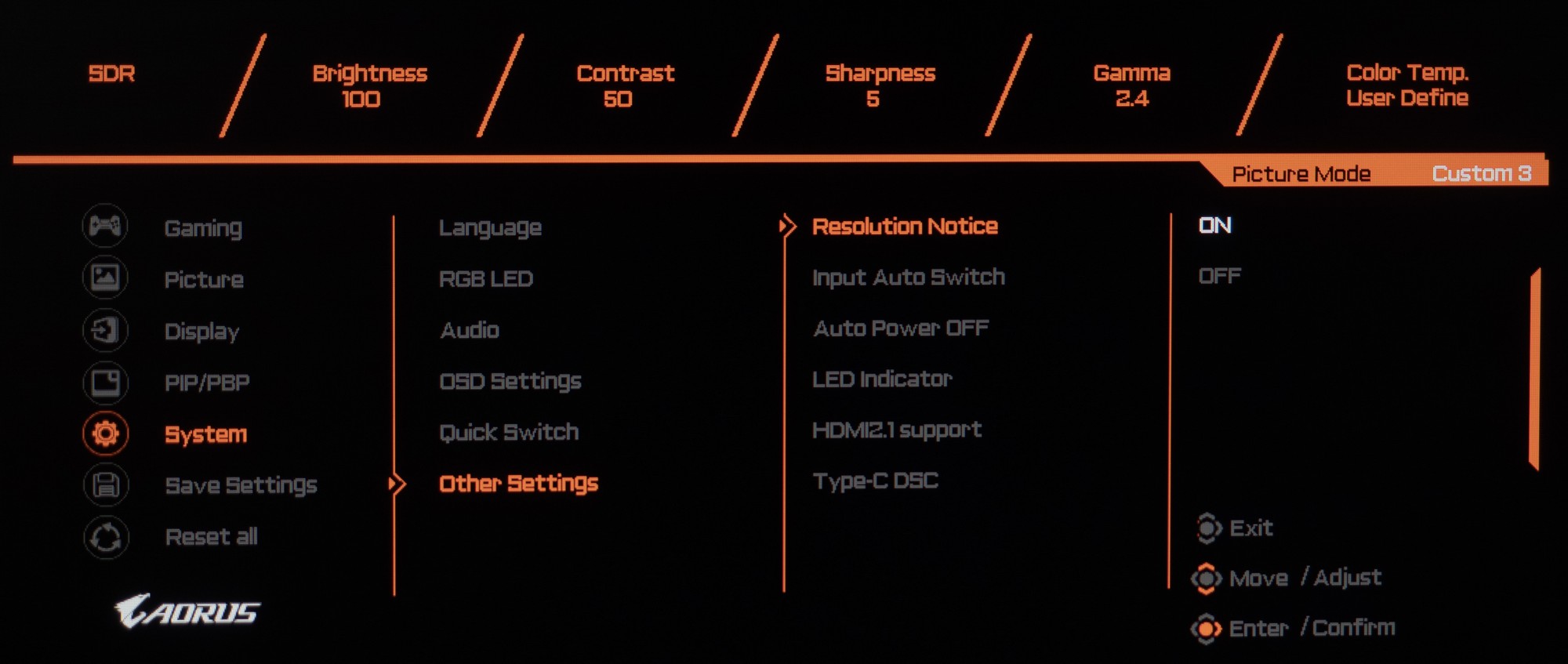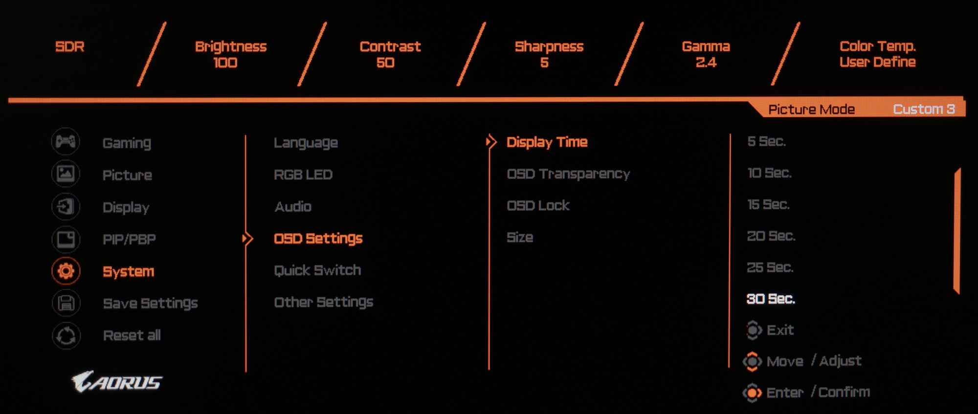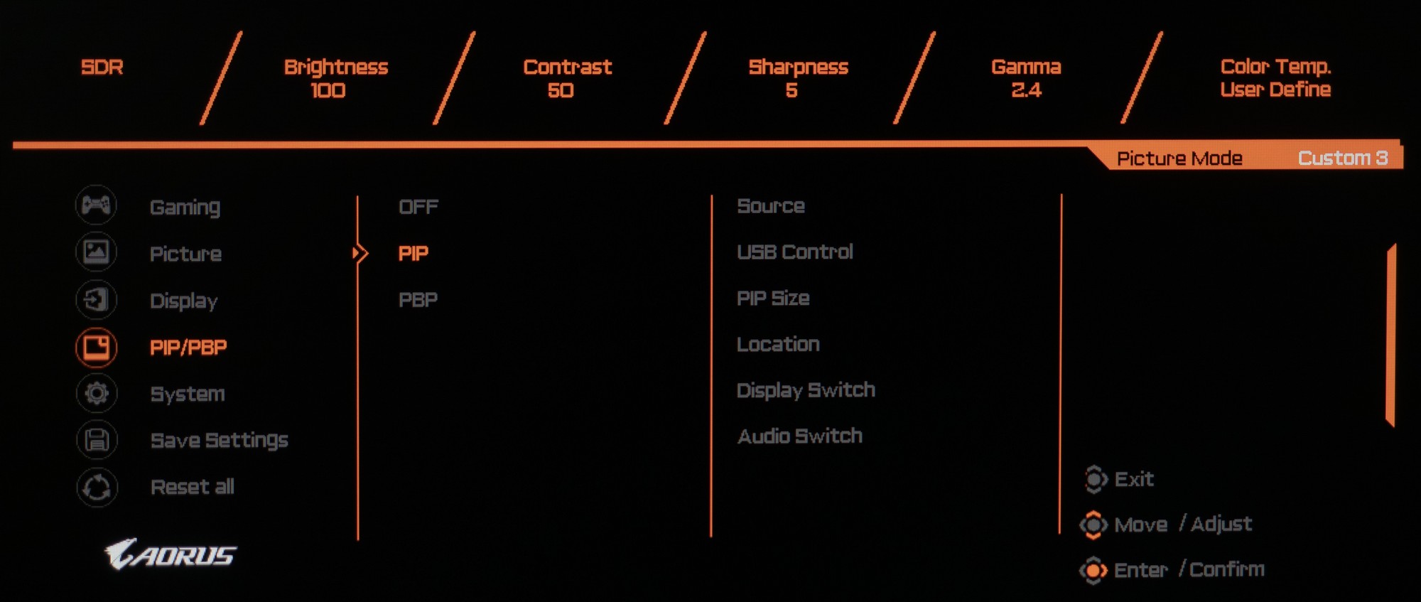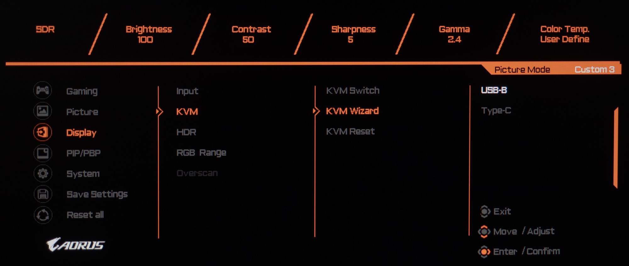 В новинке от Gigabyte предустановлено восемь основных режимов (учитывая AIM Stabilizer Sync), практически каждый из которых может быть подвержен дополнительной настройке на том или ином уровне, а также три Custom пресета, с помощью которых пользователь может создать свой «собственный мир красок» и «правильных визуальных ощущений».