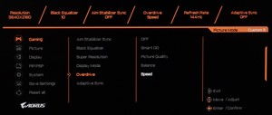 Первый раздел, Gaming, предоставляет доступ к так называемым игровым параметрам, среди которых AIM Stabilizer Sync, Black Equalizer, Super Resolution, Display Mode (настройки встроенного скалера), настройки разгона матрицы Overdrive и возможность активации Adaptive-Sync. Последняя функция также позволяет включить G-Sync Compatible в настройках драйвера NVIDIA и AMD FreeSync Premium.