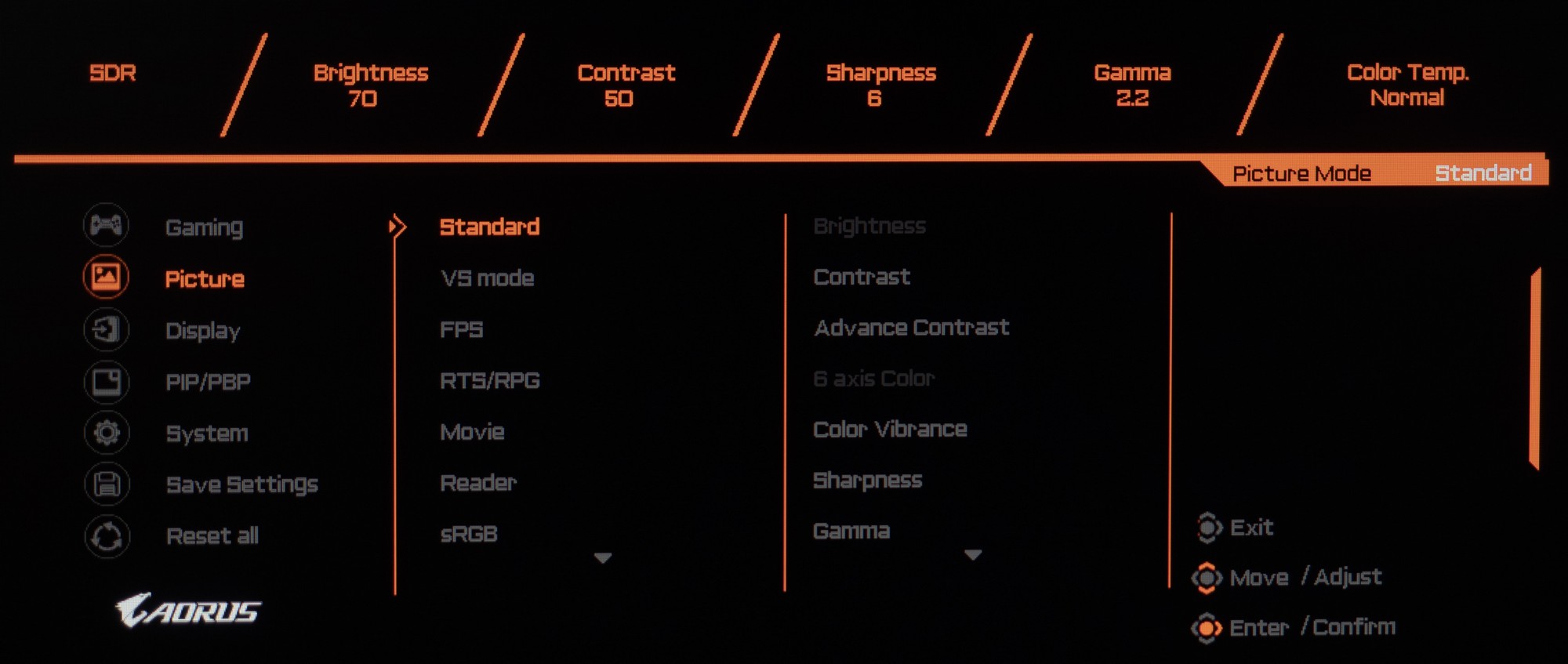 По умолчанию настройки AORUS FI32U в режиме Standard выглядят следующим образом:
