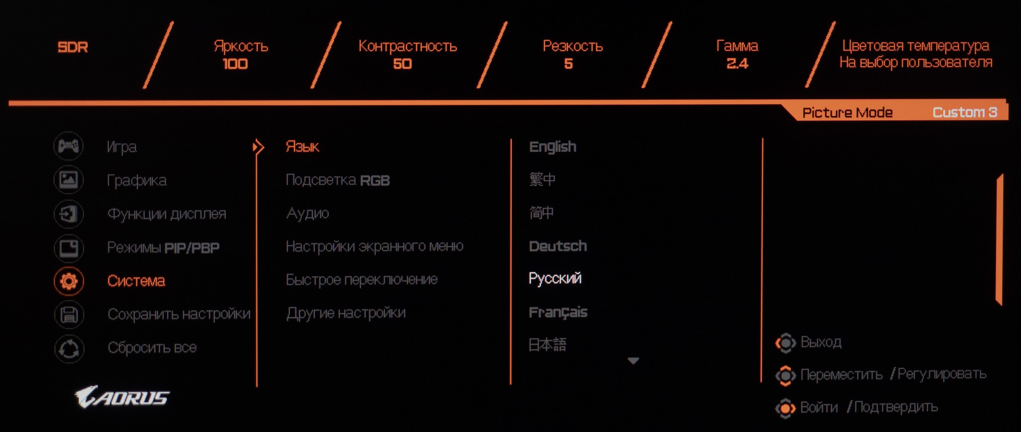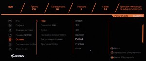 Среди вариантов локализации присутствует русский с относительно качественным переводом (но есть и серьёзные ляпы) и адекватным шрифтом. Правда, часть меню всё равно остаётся на английском, особенно это касается первоначального блока OSD и различных уведомлений.
