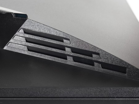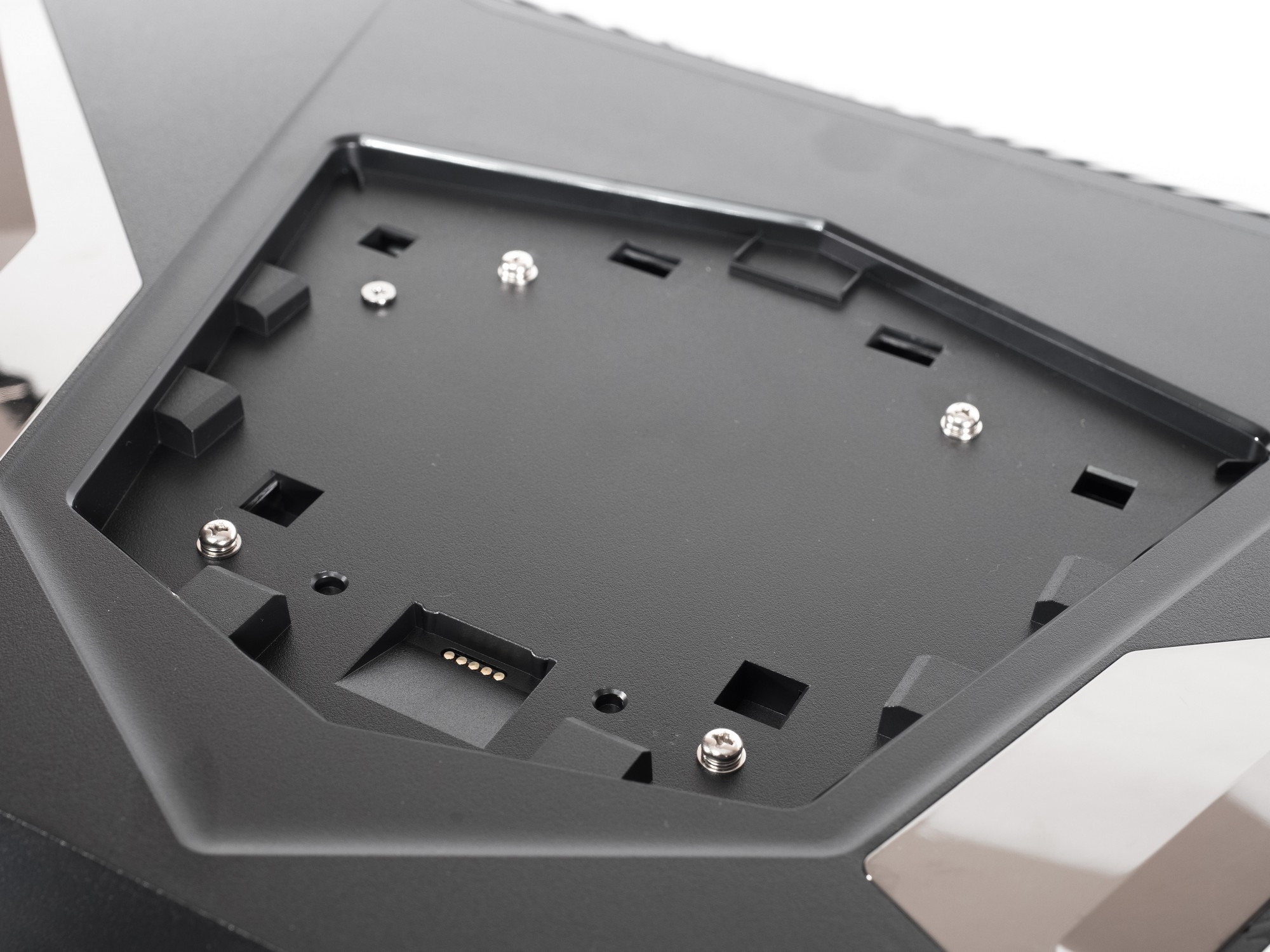 Центральная колонна обладает быстросъёмным соединением, за которым прячется VESA-совместимое крепление. Система прокладки кабелей выполнена максимально просто – с помощью прорези в нижней части стойки. Эффективность такого решения - не велика, но других вариантов всё равно не представлено.