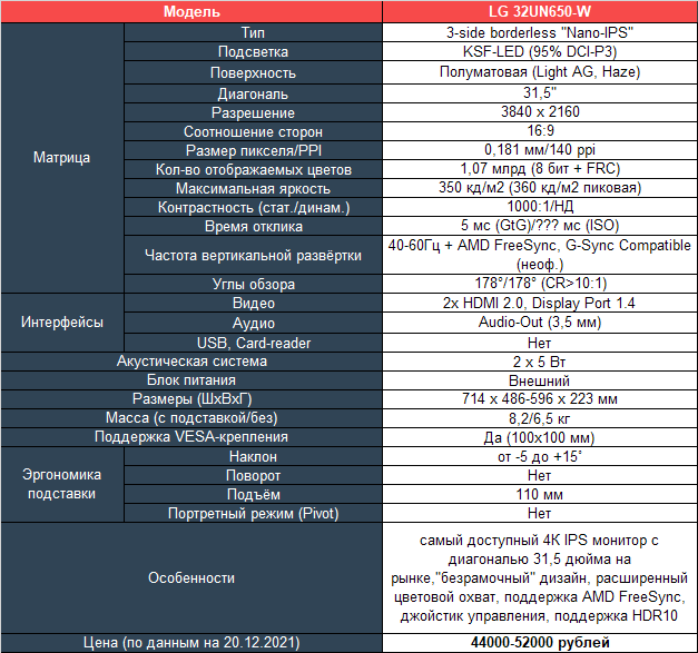 Монитор LG 32UN650-W был представлен в августе 2020-го, добрался до полок магазинов к концу года и на протяжении всего 2021-го оставался самым доступным 31,5-дюймовым 4K IPS дисплеем из присутствующих в продаже. На момент написания этого материала ближайшие конкуренты стартуют с отметки в 68 тысяч рублей, в то время как 32UN650-W можно найти при лучшем стечении обстоятельств за 44-45 тысяч. И можно было бы подумать, что за такие деньги ничего хорошего вам не светит, а производитель просто установил какую-то низкосортную матрицу из того, что смог найти в Китае, но на самом деле это всё далеко от истины и вот почему: