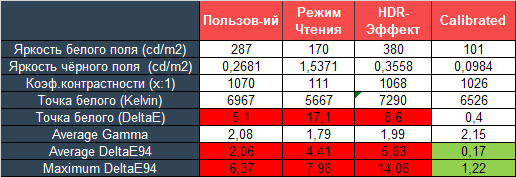 При настройках по умолчанию яркость выставлена на высоком уровне, с глубиной чёрного проблем нет, точка белого близка к 7000К, а контрастность изображения снижена. А в условиях широкого цветового охвата, который всё же не достигает 100% DCI-P3, полученные отклонения DeltaE94 легко объяснимы. Кратко – это средний уровень заводской настройки.