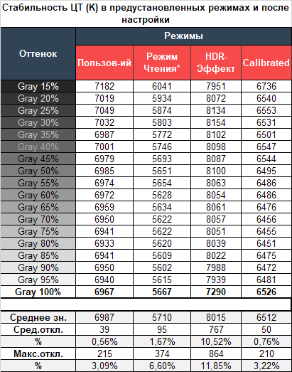 Уровень стабильности цветовой температуры при заводских установках оказался очень высоким и чуть хуже, чем в 32UN880. В режимах для чтения и HDR эффекте значения увеличиваются, но остаются максимально приближенными к полученным на «старшем брате». Калибровка же практически не изменила расстановку позиций о чём говорят не только цифры, но визуальные ощущения.