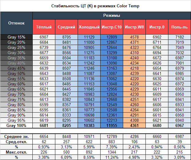 Результаты данной таблицы представляют из себя отклонения точек серого клина по оси X. Вертикальную ось они не затрагивают, а поэтому оценить наличие паразитных оттенков возможно лишь по CIE диаграмме из подраздела “Гамма-кривые, баланс серого и результаты UDACT”.