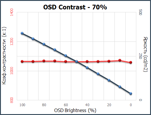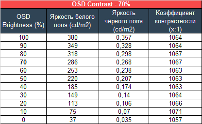 Для изучения стабильности контрастности и диапазона изменения яркости был выставлен режим «Пользователь». Значение Brightness менялось с 100 до 0% с шагом в 10 процентов. Для представленной ниже таблицы измеренные значения были получены через программу HCFR, которая даёт возможность более точно оценить уровень чёрного (три знака после запятой) и соответственно определить достоверный коэффициент контрастности.