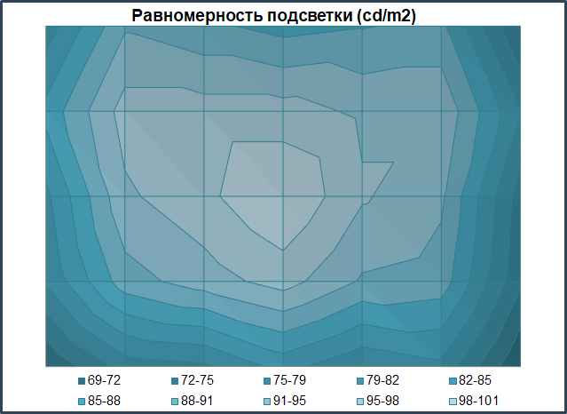 По представленной диаграмме поверхности можно наглядно увидеть, как сосредоточен уровень яркости по полю матрицы. У нашего экземпляра светлая зона смещена немного выше и левее центра. Нижний край панели затемнен достаточно сильно, как и все четыре угла.