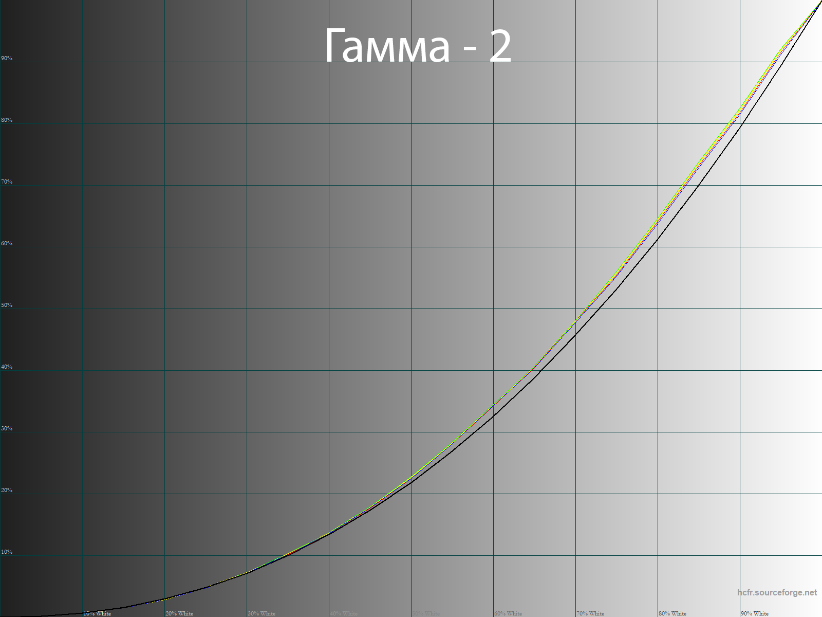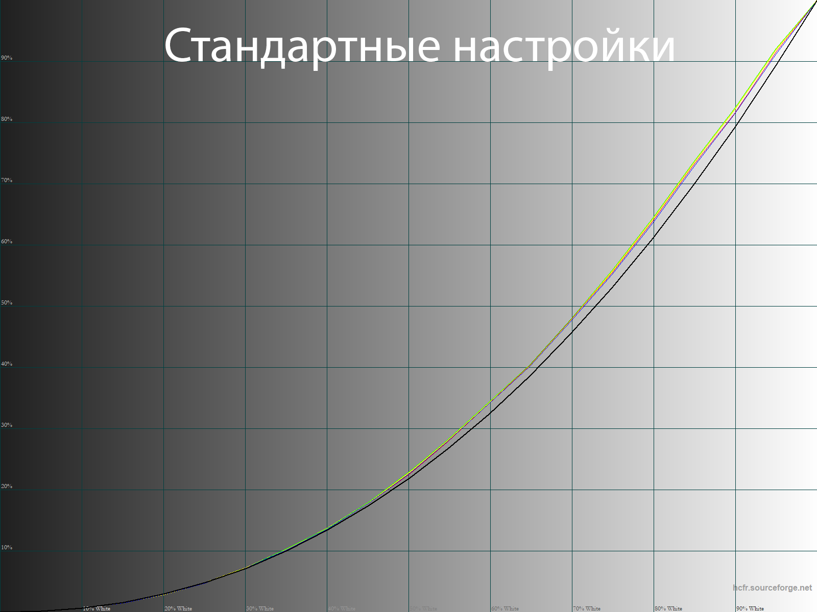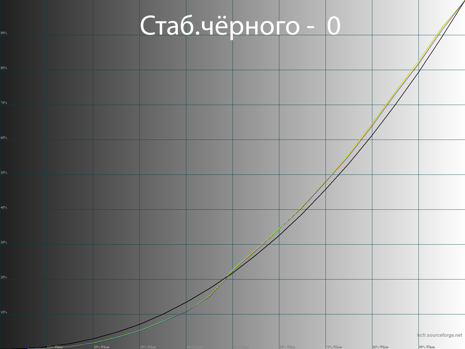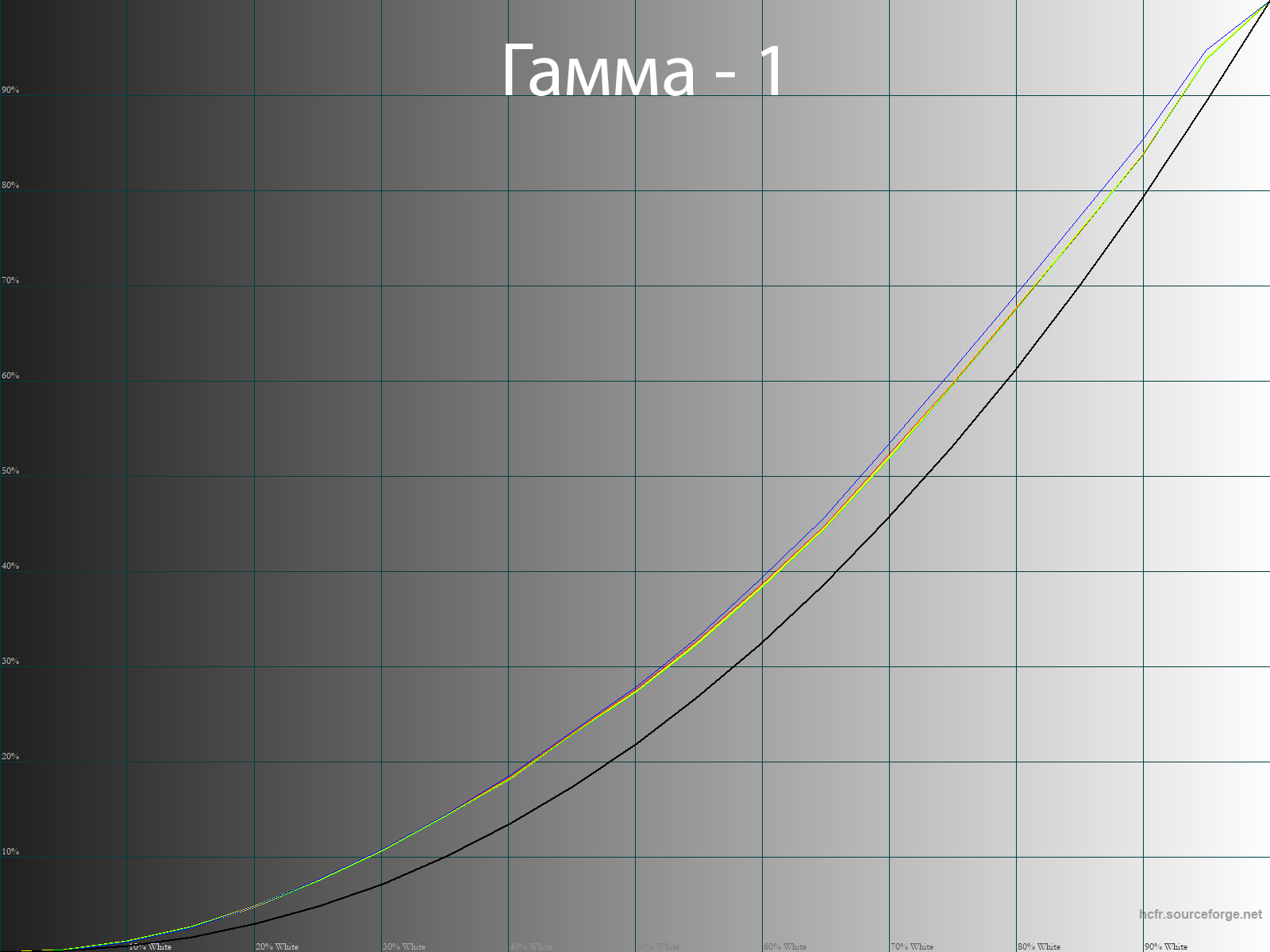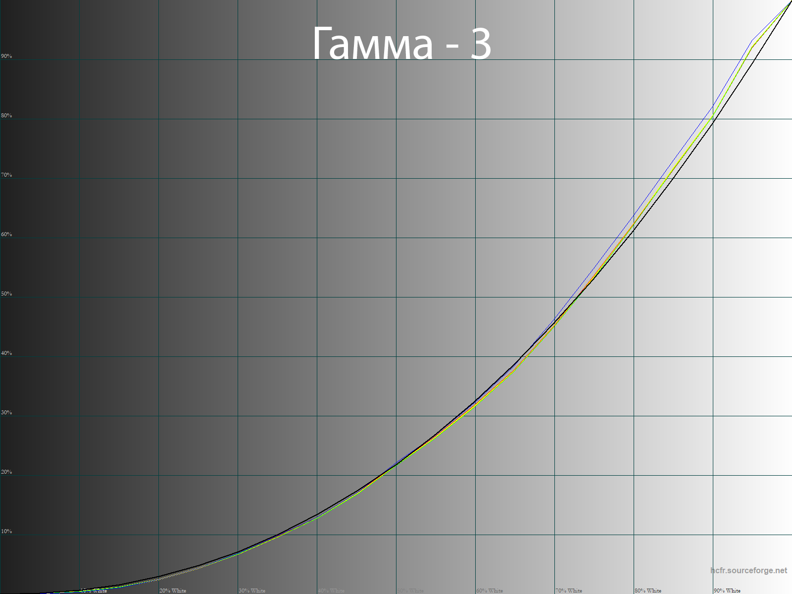С помощью программы HCFR Colormeter и “откалиброванного” колориметра X-Rite Display Pro мною были изучены гамма-кривые во всех рассмотренных выше “режимах”, как изначально предустановленных, так и специально “разработанных”. Кроме того, по произведённым измерениям можно оценить расхождение серого клина (точек чёрно-белого градиента) на CIE диаграмме и сделать выводы о преобладании того или иного паразитного оттенка, либо его таковом отсутствии.