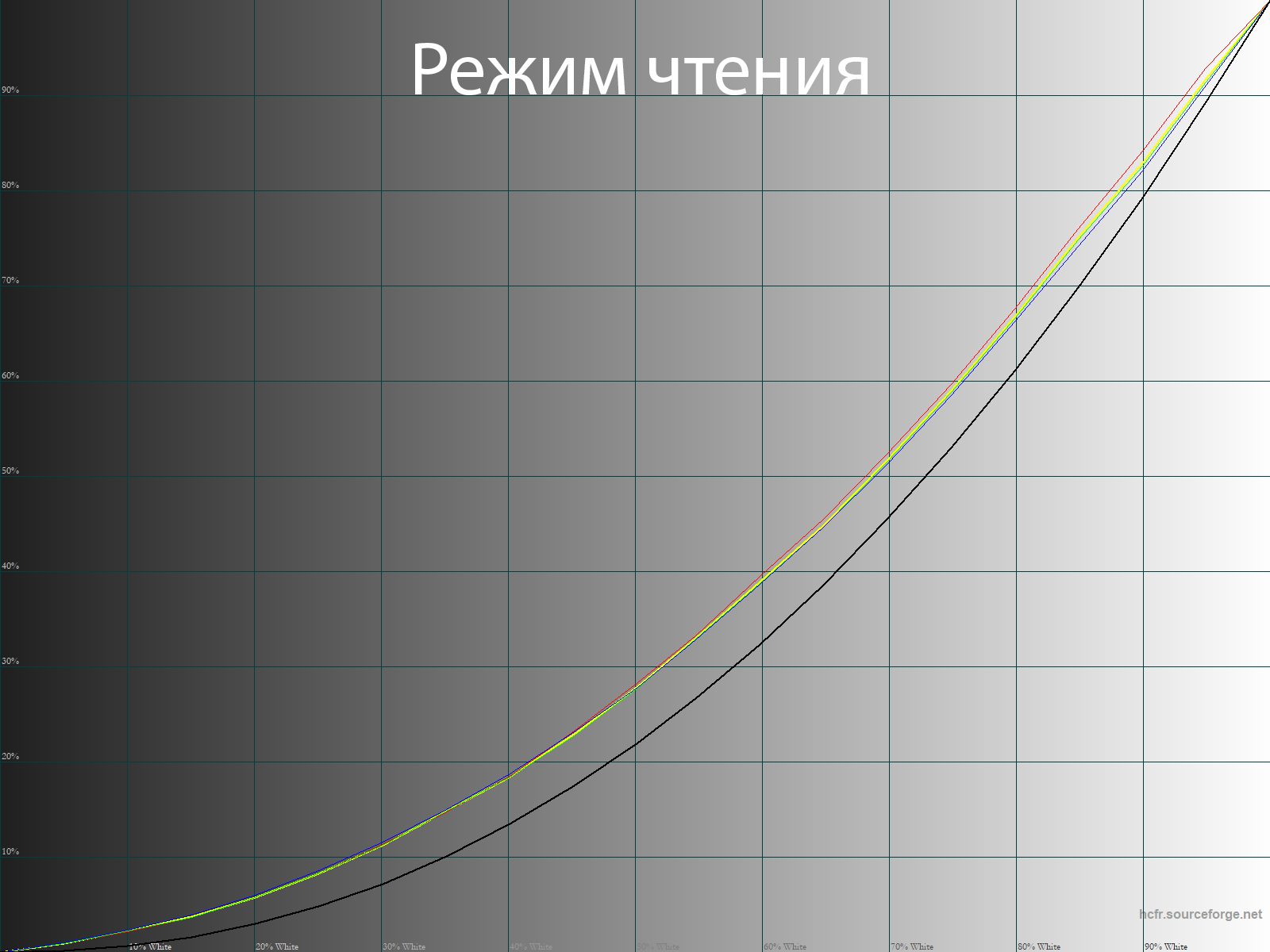 Режим для чтения настроен для своего предназначения более чем корректно. Снижена яркость (можно снизить ещё сильнее), коэффициент контрастности снижен почти в 10 раз, светимость чёрного целых 1,5 нит, а гамма выстроена таким образом, что контрастность картинки снижается глобально во всём диапазоне. В данном случае смотреть на отклонения цветопередачи – бессмысленное занятие. Режим сделан для снижения нагрузки на глаза и после ручной регулировки яркости он с этим прекрасно справится.