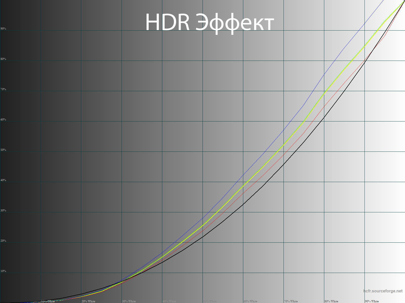 В HDR Эффект ситуация обратная. Точки белого смещены в холодную зону с паразитным оттенком, синий канал нарушает общий баланс и приводит к раннему перенасыщению светлых полутонов, контрастность из-за этого увеличивается, но ничего красивого на экране вы не получите. Будьте в этом уверены! Никакого прямого отношения к настоящему HDR данный режим не имеет.