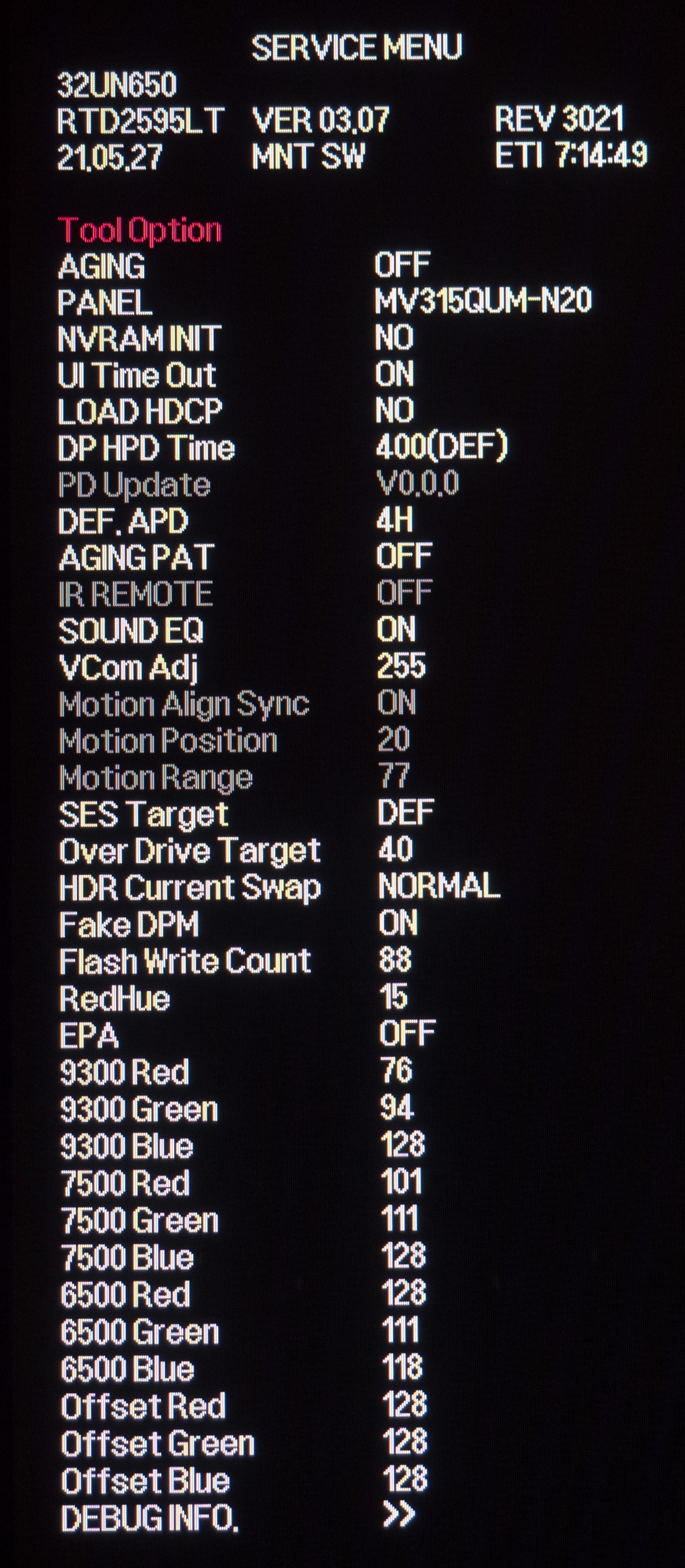 По подтверждённым данным новинка построена на базе IPS-матрицы MV320QUM-N20 производства китайской компании BOE, что было подтверждено с помощью сервисного меню монитора. Точно такая же панель используется в рассмотренном нами ранее мониторе LG 32UN880 со Ergo-подставкой за совсем другие деньги – порядка 75000 рублей. Да, та же самая матрица, той же самой ревизии!