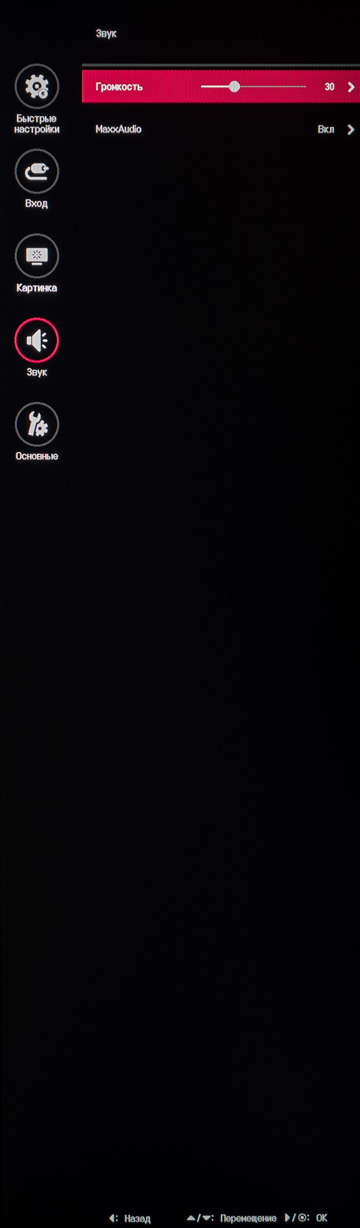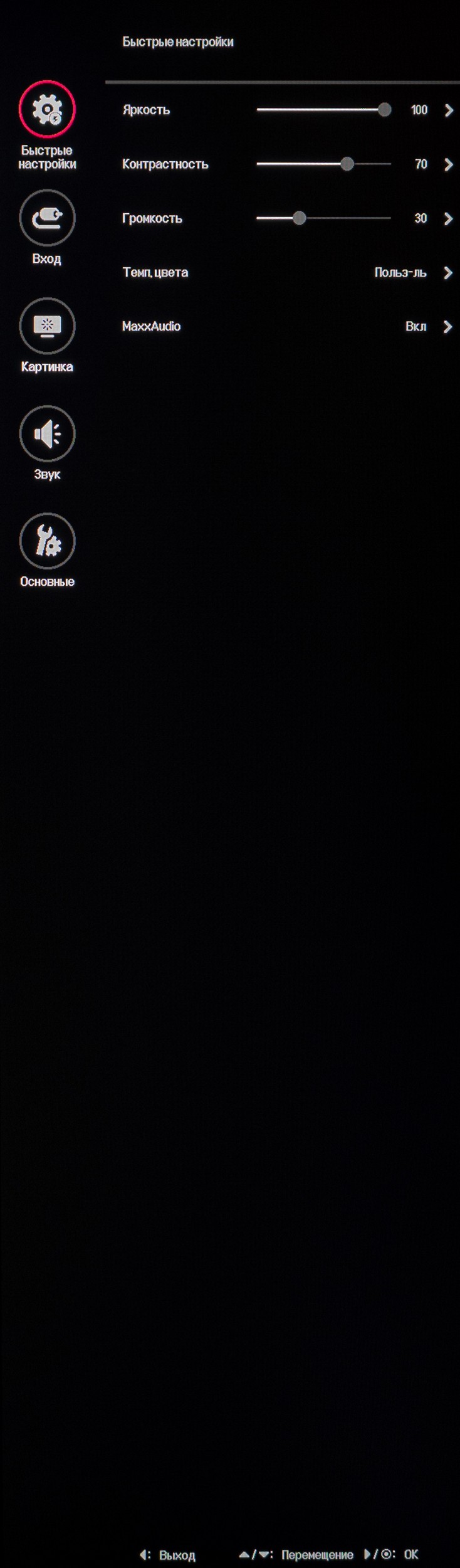 Меню монитора состоит из пяти подразделов. В первом можно регулировать яркость, контрастность, громкость подключённого внешней акустической системы, температуру цвета и быстро выключить систему улучшения звука в наушниках MaxxAudio (смысла в данном действии – 0).