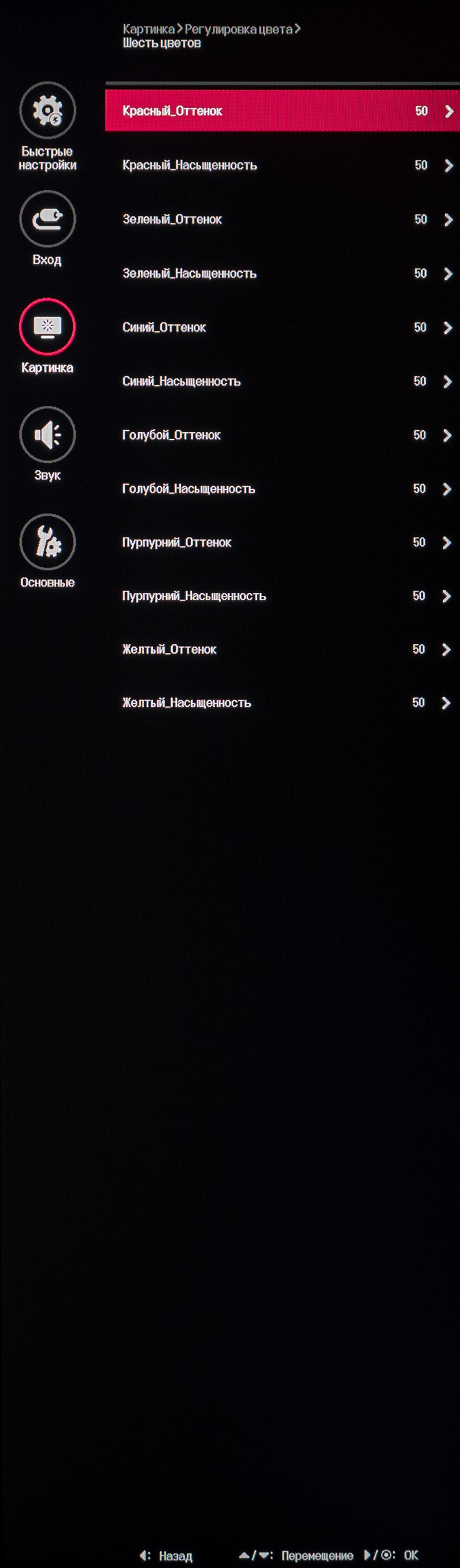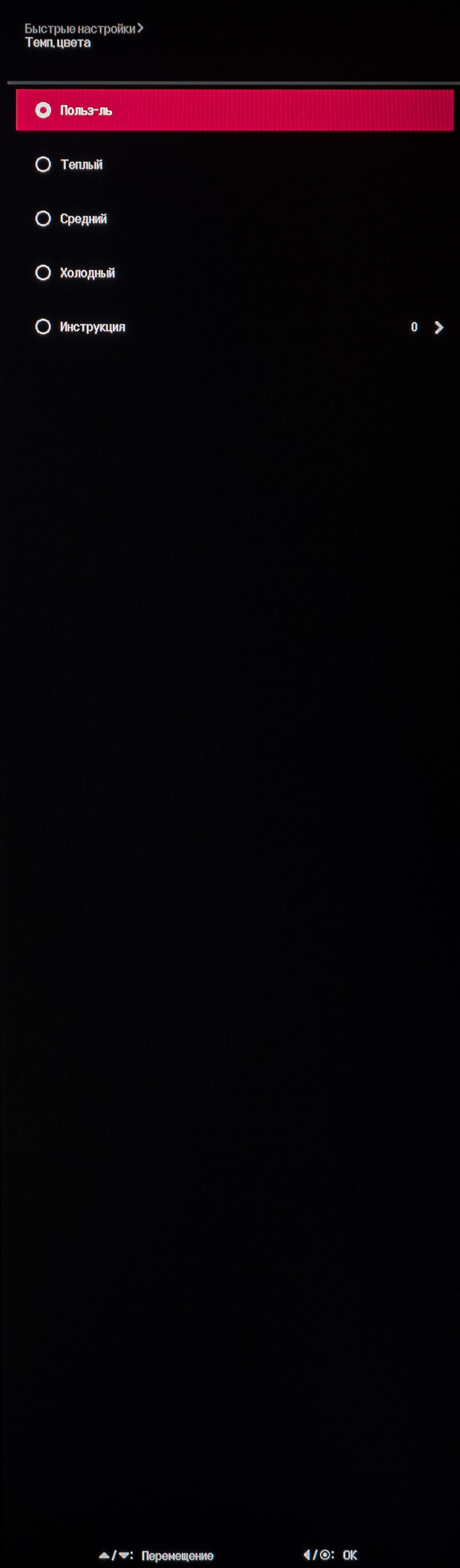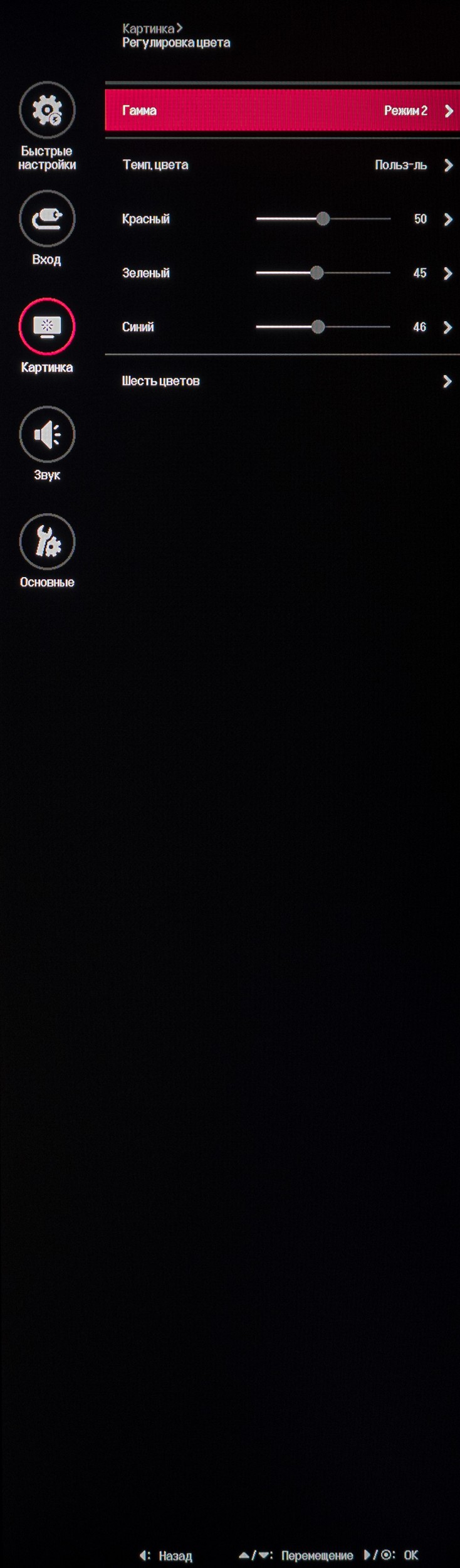 В последнем подразделе предлагается изменить режим гаммы, цветовой температуры, установить усиление RGB каналов (для ручной настройки точки белого), произвести 6-осевую коррекцию цвета по сдвигу и насыщенности. Касательно режимов ЦТ – производитель вновь пришёл к нескольким основным вариантам и добавил более плавную регулировку в пункт со странным переводом «Инструкция» и значениями от W8 до С10.