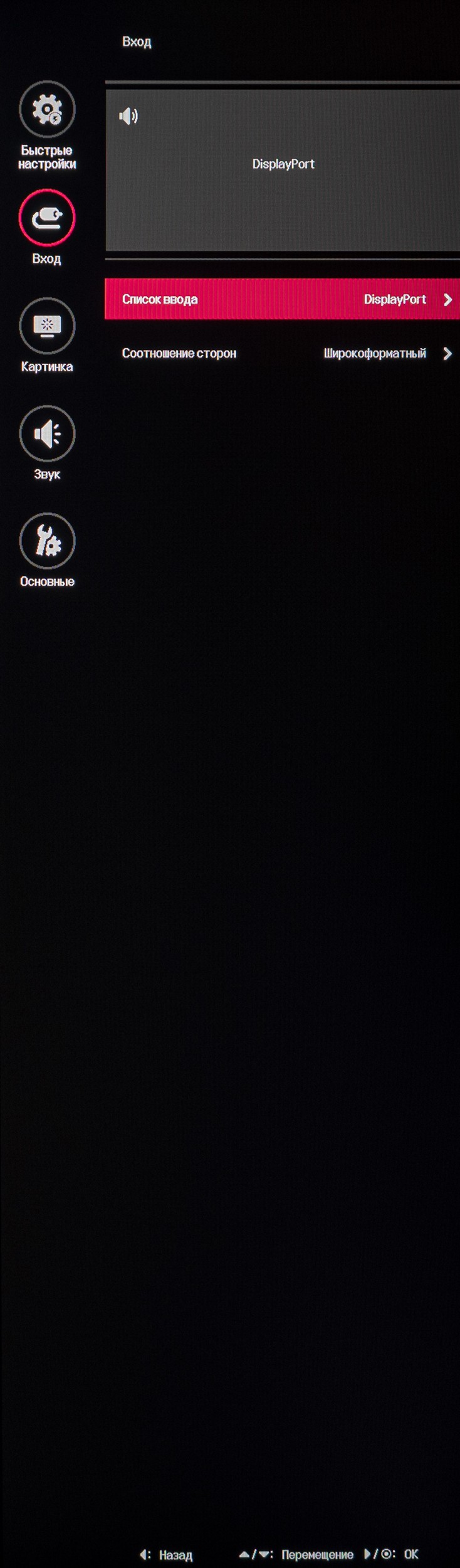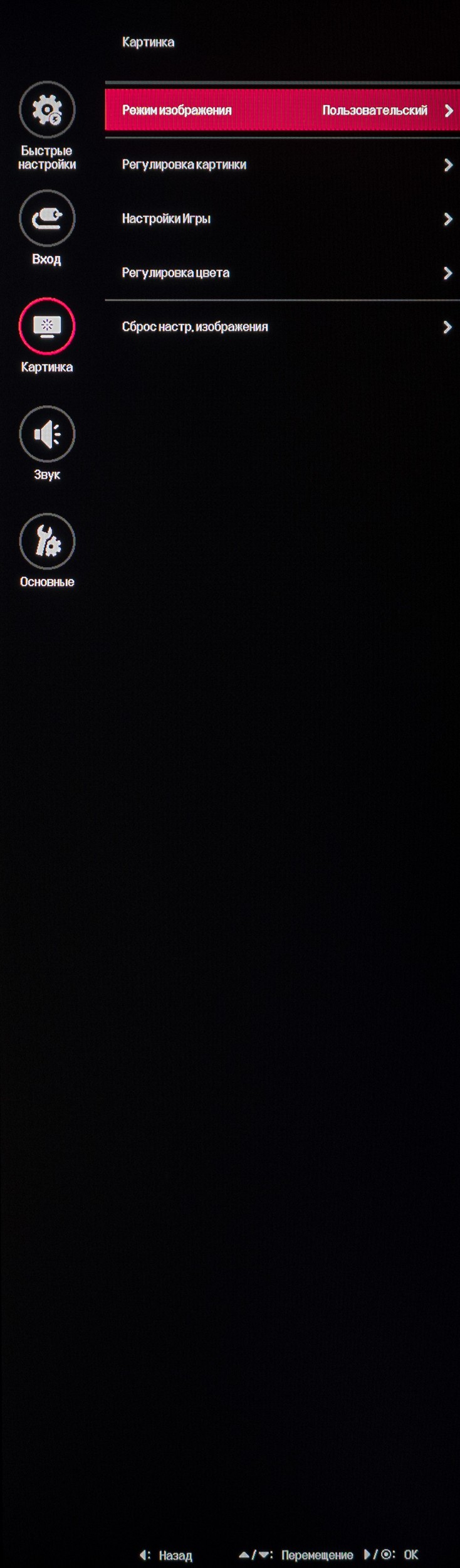Внешний вид меню рабочих (не игровых) мониторов LG остаётся неизменен на протяжении последних 5-8 лет. Это просто большое чёрное окно во всю высоту экрана, «прилепленное» к его правой части. Про дизайн тут сказать нечего. Скорость анимации и прорисовки интерфейса в случае с изучаемым монитором вызывают нарекания, но ничего не поделать – с этим придётся жить.