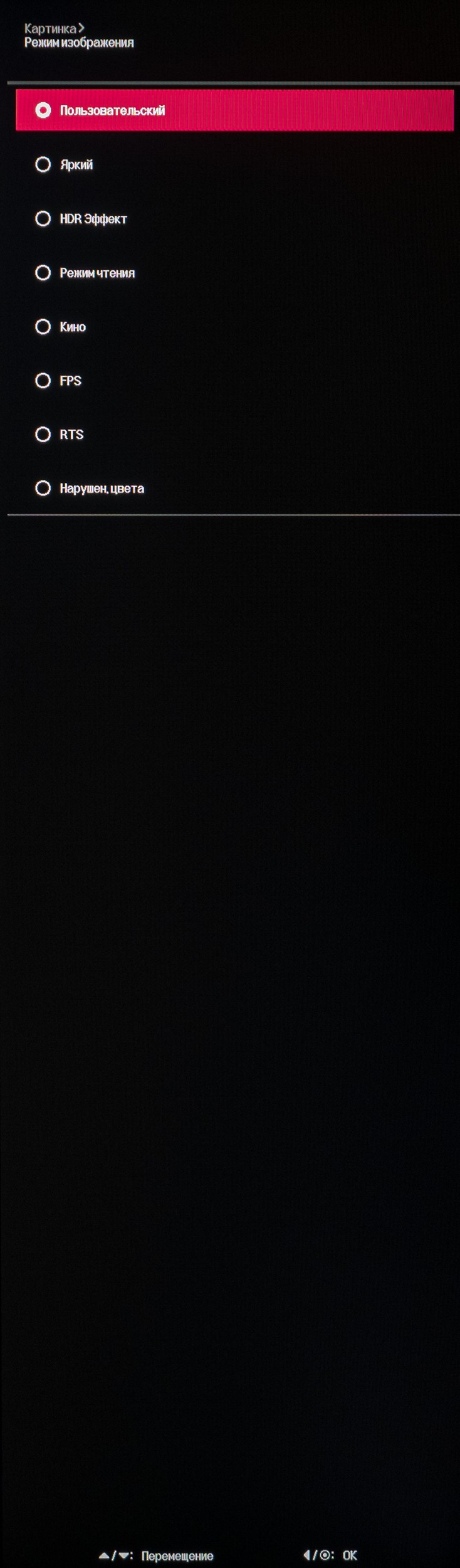У рассматриваемого монитора присутствует восемь предустановленных режимов из которых мы решили протестировать только три. По умолчанию используется пресет «Пользовательский» со следующими настройками:
