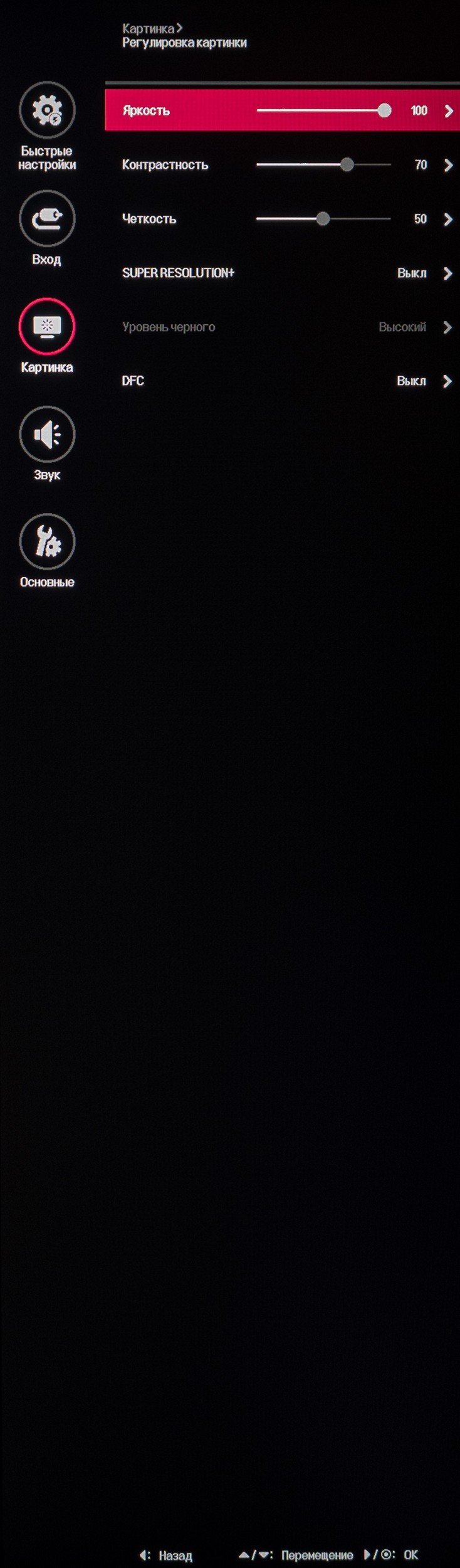 Раздел «Картинка», как и всегда, поделен на четыре подраздела. В первом выбирается предустановленный режим изображения. Во втором находятся настройки яркости, контрастности, специальные параметры типа усиления резкости, настройки глубины чёрного при HDMI подключении, SuperResolution+ и DFC (динамическая контрастность).