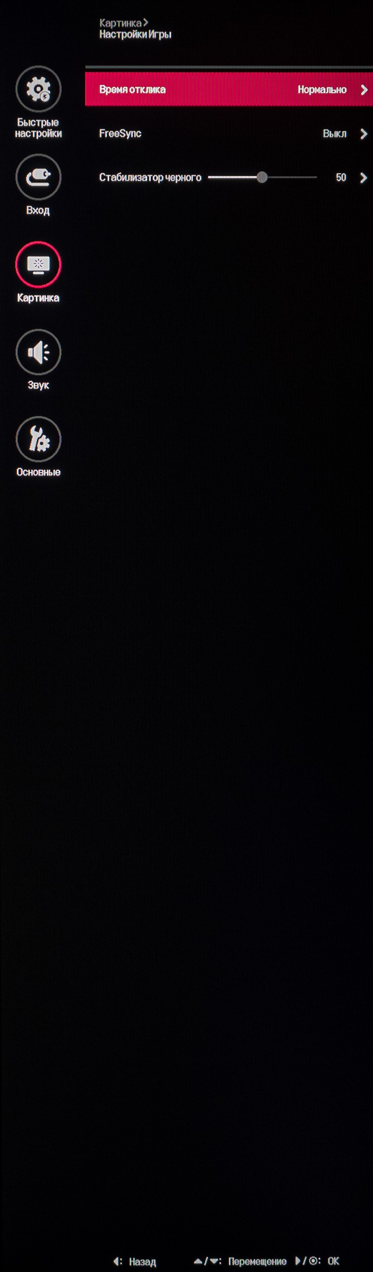 В третьем подразделе «Настройки игры» пользователь может выставить степень усиления разгона матрицы, активировать технологию FreeSync (необходима и для включения G-Sync Compatible в драйвере NVIDIA) и увеличить или уменьшить различимость крайних тёмных полутонов с помощью функции «Стабилизатор чёрного».
