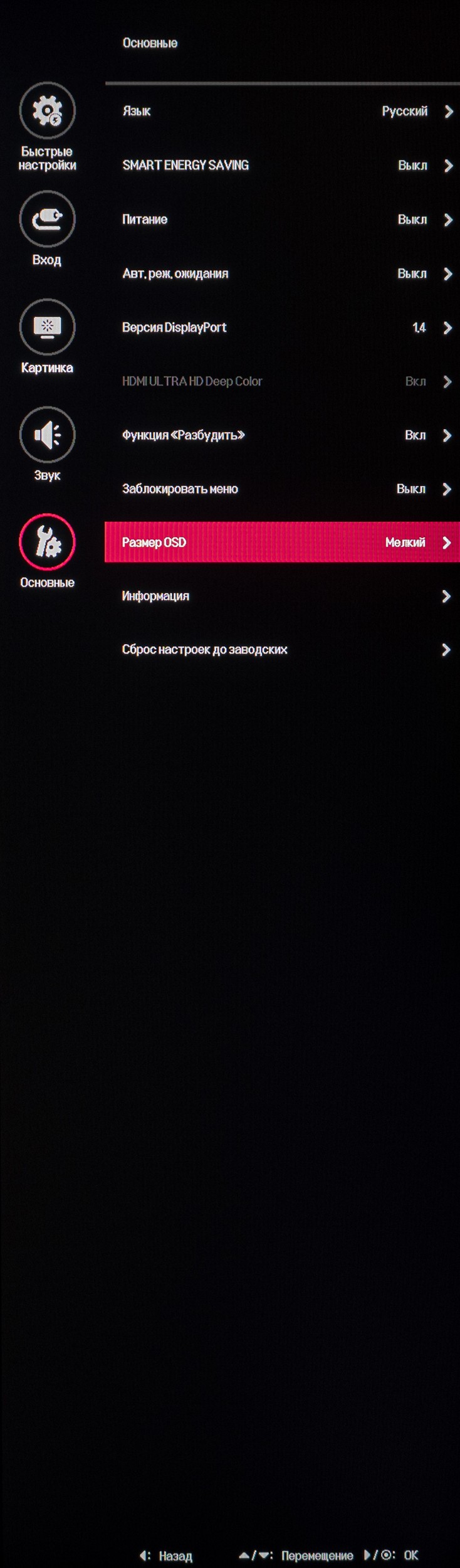 Изменить язык локализации, включить или выключить светодиод питания, активировать автоматический переход в режим ожидания, задействовать стандарт DisplayPort 1.4, функцию «Разбудить», режим энергосбережения (просто блокируется яркость на определённом значении) и заблокировать меню – всё это можно сделать в разделе «Основные». Здесь же можно сбросить все настройки к заводским значениям и посмотреть основную рабочую информацию по монитору.