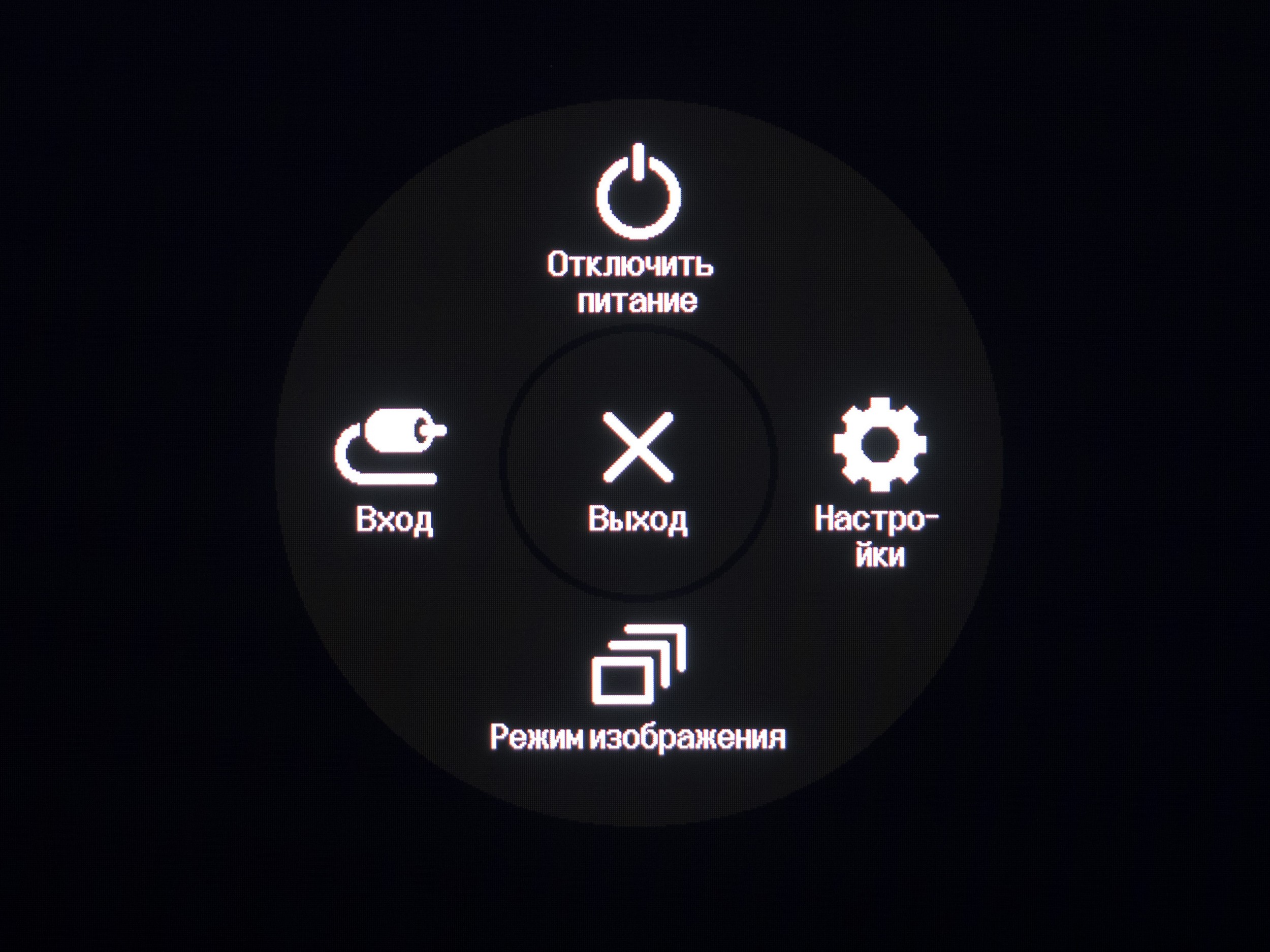 Нажатие джойстика проводит к появлению на экране специального кругового OSD меню с пятью пиктограммами. Через них можно попасть в основное меню, выбрать источник сигнала и режим изображения, убрать меню. С помощью сдвига джойстика влево-вправо можно попасть только к быстрой регулировке уровня громкости.