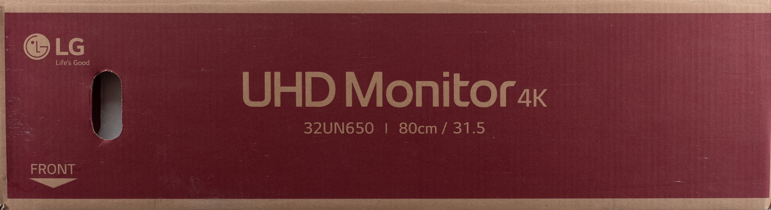 Монитор LG поставляется в небольшой картонной коробке без особых визуальных изысков. Пластиковая ручка для переноски отсутствует, вместо неё по одному специальному вырезу сверху и снизу.