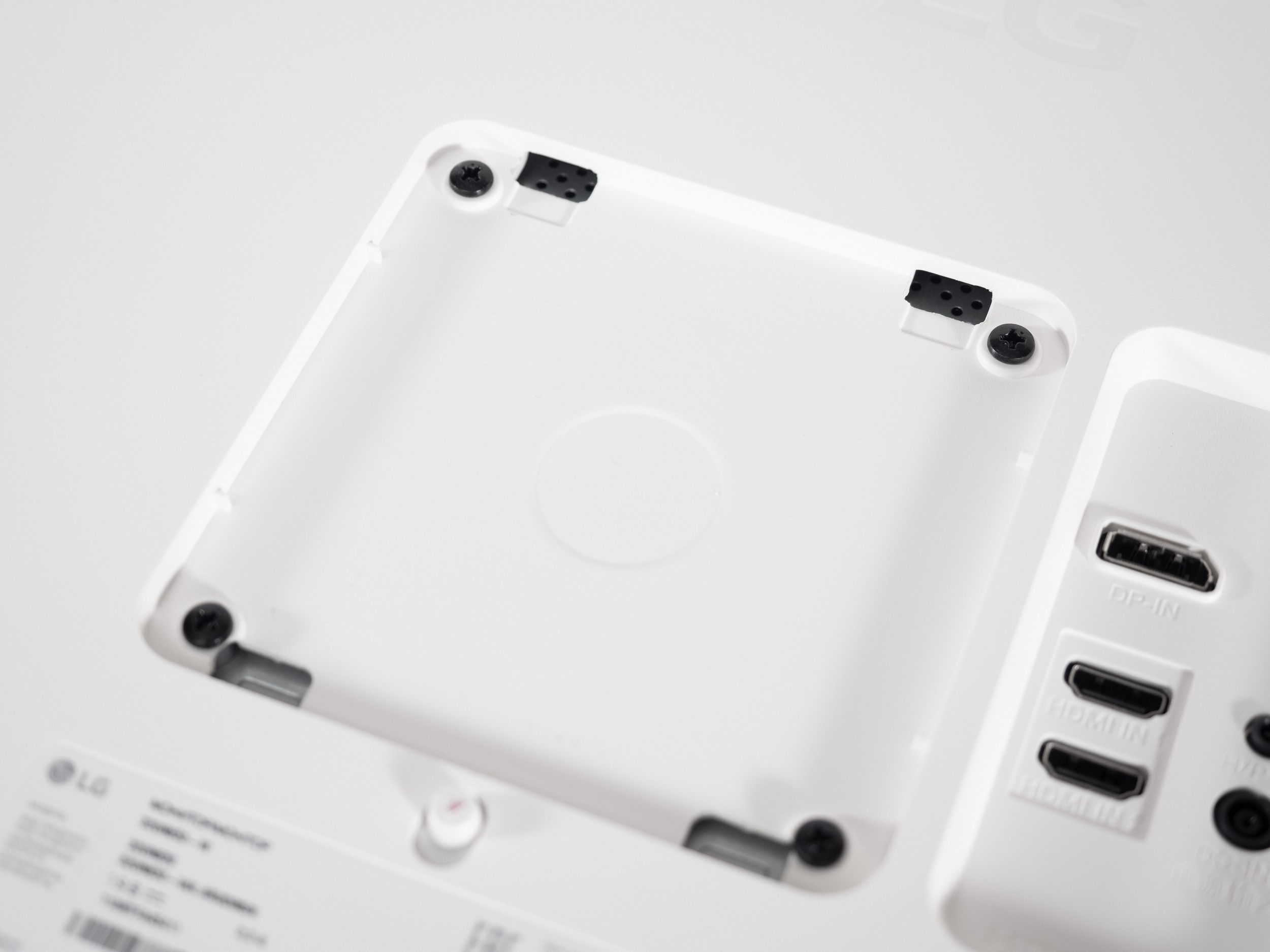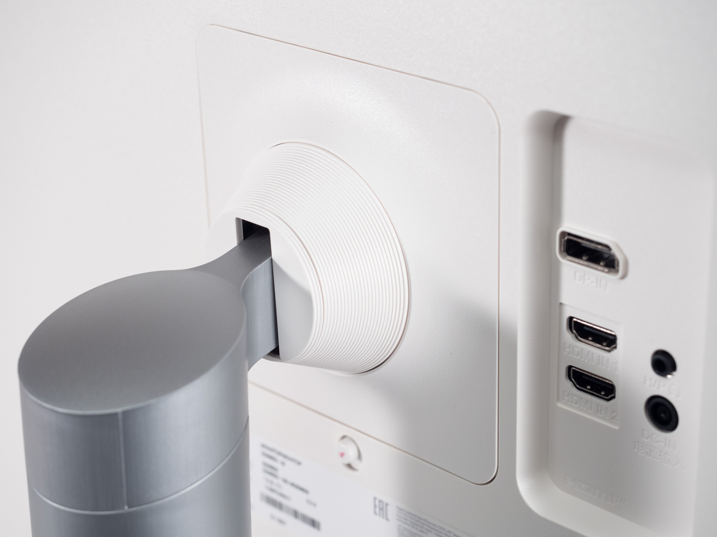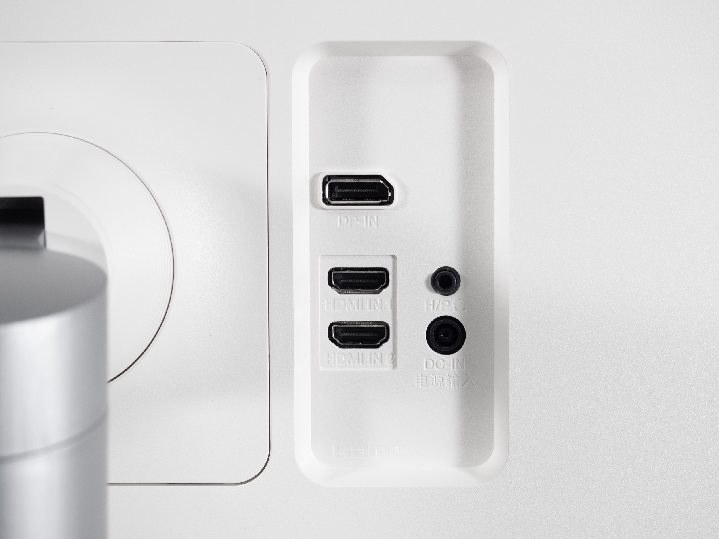 В задней части монитора на колодке для подключения кабелей находятся следующие разъемы, ориентированные назад: питание, DisplayPort 1.4, два HDMI 2.0, Audio-Out для вывода звука на наушники или внешнюю акустическую систему.