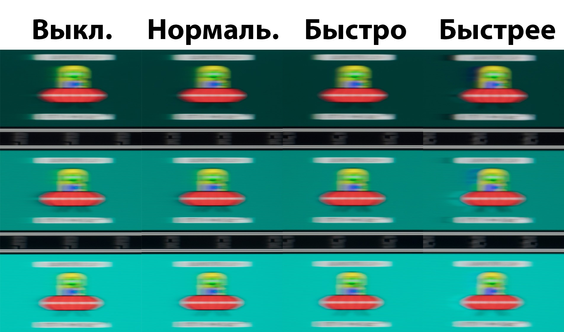 В положении OD «Выкл.» разгон действительно выключается, а шлейфы заметно увеличиваются. При переходе в «Нормальный» разницу со стандартными настройками уловить не просто, а вот при выставлении «Быстрее» артефакты начинают проявлять себя везде, где только возможно. Таким образом, наиболее адекватное значение разгона выбрано производителем по умолчанию. Экспериментировать нет смысла.