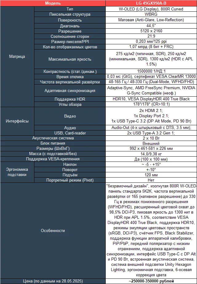 По подтверждённым данным монитор LG 45GX950A-B построен на базе единственной в своём роде W-OLED-матрицы LG Display с диагональю 44,5 дюйма, соотношением сторон 21:9, увеличенным рабочим разрешением 5120 х 2160 пикселей (стандарт 5К2К) и нативной частотой вертикальной развёртки 165 Гц. Экран сильно изогнут — степень кривизны составляет 800R против более популярных 1500-1800R — всё для максимального погружения в происходящее на экране.