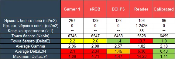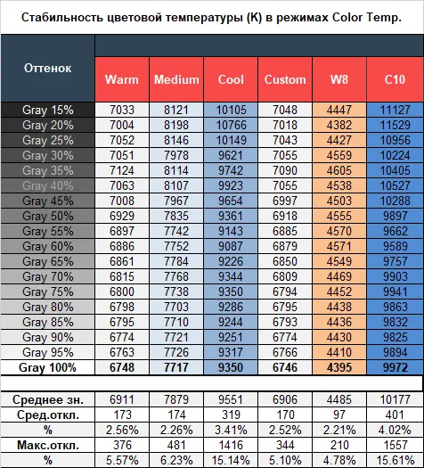 Теперь рассмотрим результаты специальных режимов Color Temp. Напомним, что по умолчанию производитель установил пресет Custom со значениями RGB 50/50/50. Поэтому стоит учитывать, что значения его столбца полностью совпадают с результатами режима Gamer 1 из первой таблицы данного подраздела тестирования. Остаётся лишь поговорить про оставшиеся предустановки ЦТ с разными значениями и расширенные настройки точки белого из подраздела Instruction:
