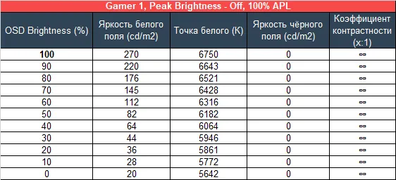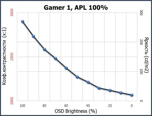Для изучения стабильности контрастности и диапазона изменения яркости был выставлен режим Gamer 1. Значение Brightness менялось с 100 до 0% с шагом в 10 единиц. Функция Peak Brightness была принудительно выключена.