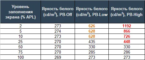 Изменение уровня APL до уровня 2-3% слегка меняет ситуацию — диапазон расширяется до 20-277 нит, однако, радоваться здесь нечему — цветовая температура во всём диапазоне регулировки яркости меняется более чем на 1100К.