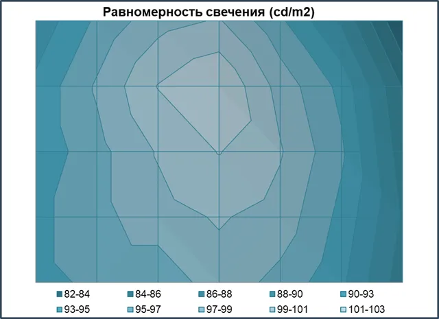 По представленной диаграмме поверхности можно наглядно увидеть, как сосредоточен уровень яркости по полю матрицы. Хуже всего показал себя правый край панели, отчётливо отличающийся от центральной части панели и левой зоны.