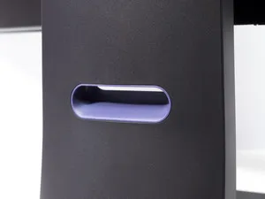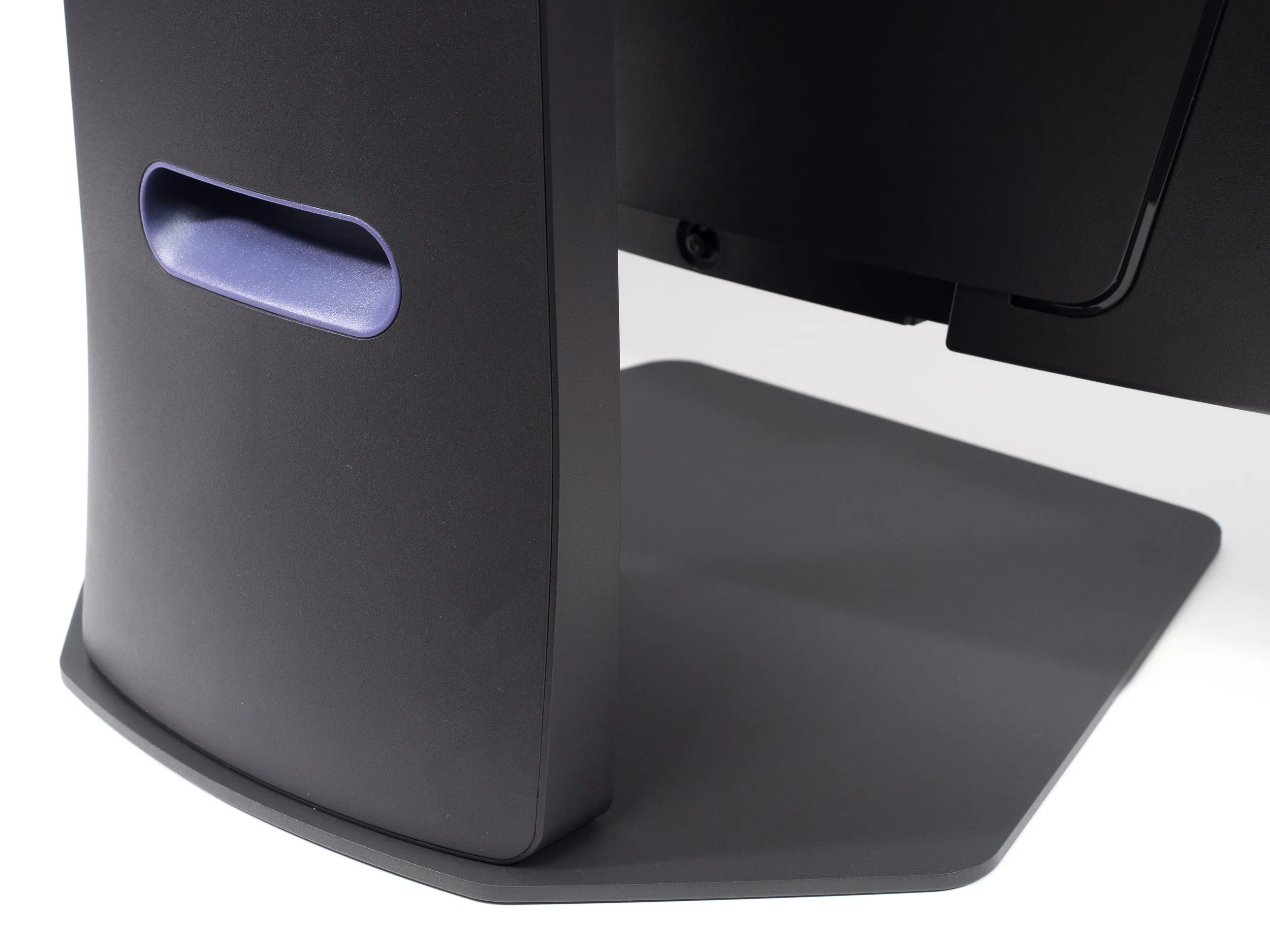 Монитор установлен на небольшой фигурной подставке, выполненной из крашенного металла. Центральная колонна увеличена в своих габаритах, а для системы прокладки кабелей в ней проделана прорезь с установленной фиолетовой вставкой.