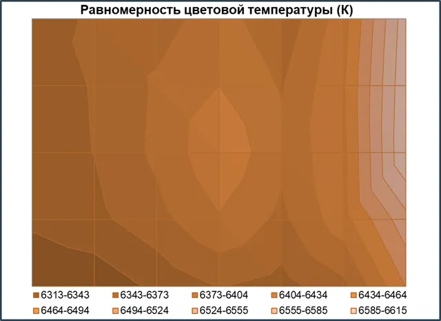 Что же касается равномерности цветовой температуры, то результаты оказались следующими: среднее отклонение от центра — 1,1%, максимальное — 2,4%. Разница между минимумом и максимумом слегка превысила 300К. Для крупного и редкого W-OLED результат очень хороший, но заметить разницу между частями всё же можно… и достаточно просто.