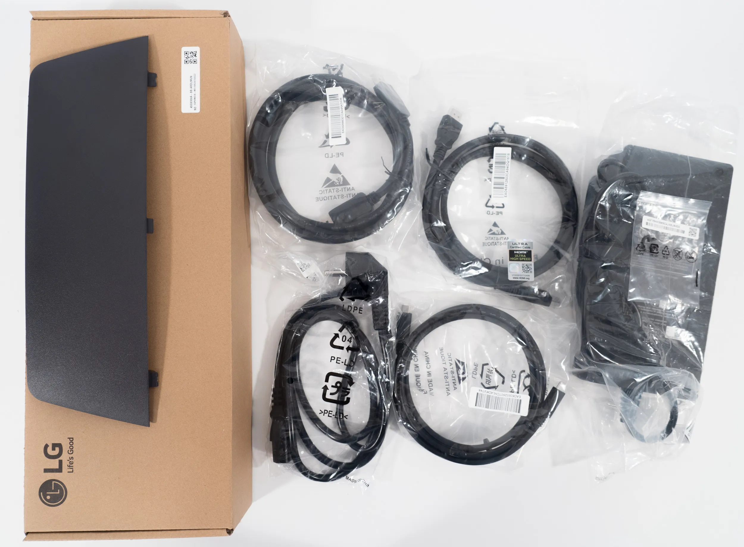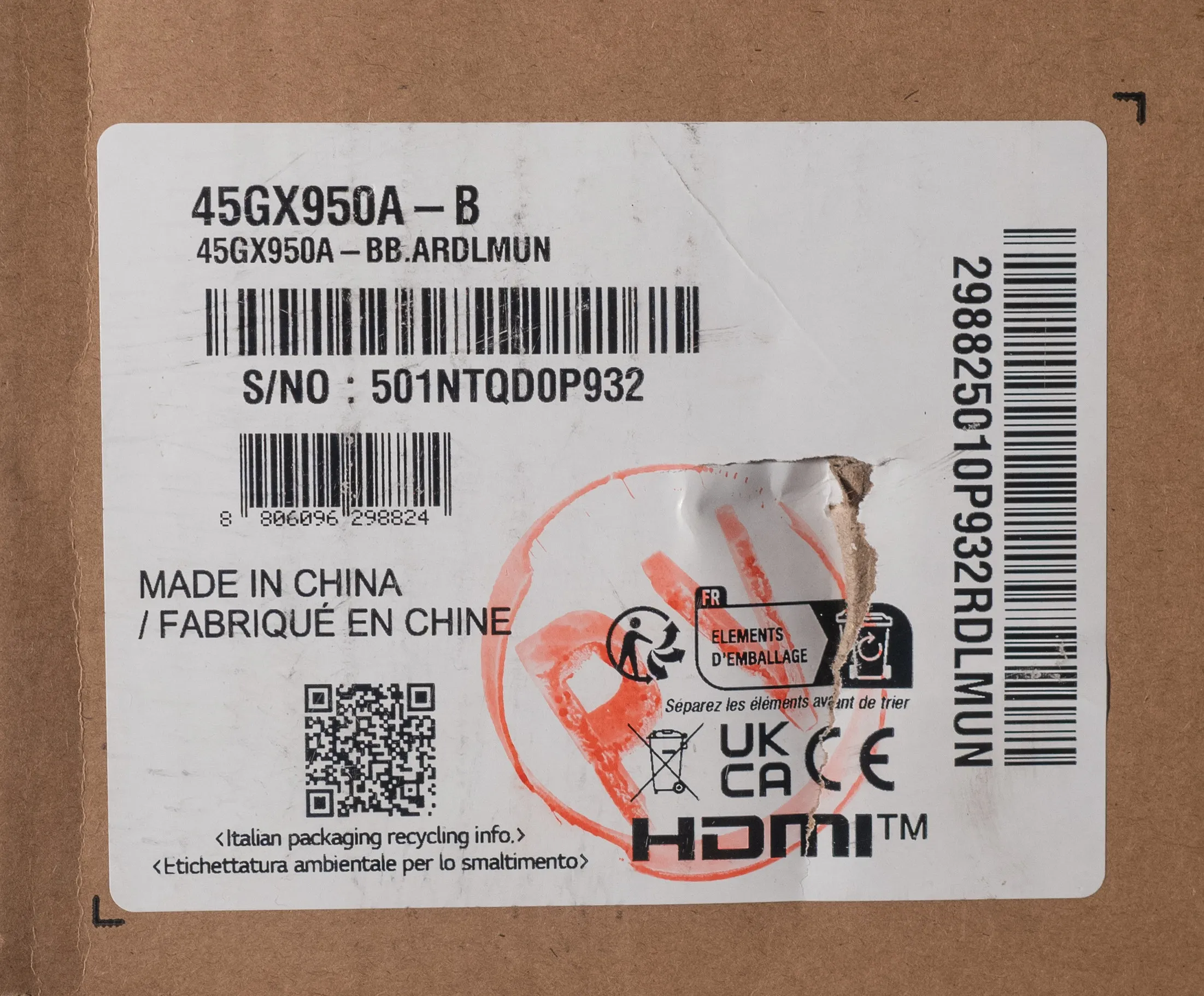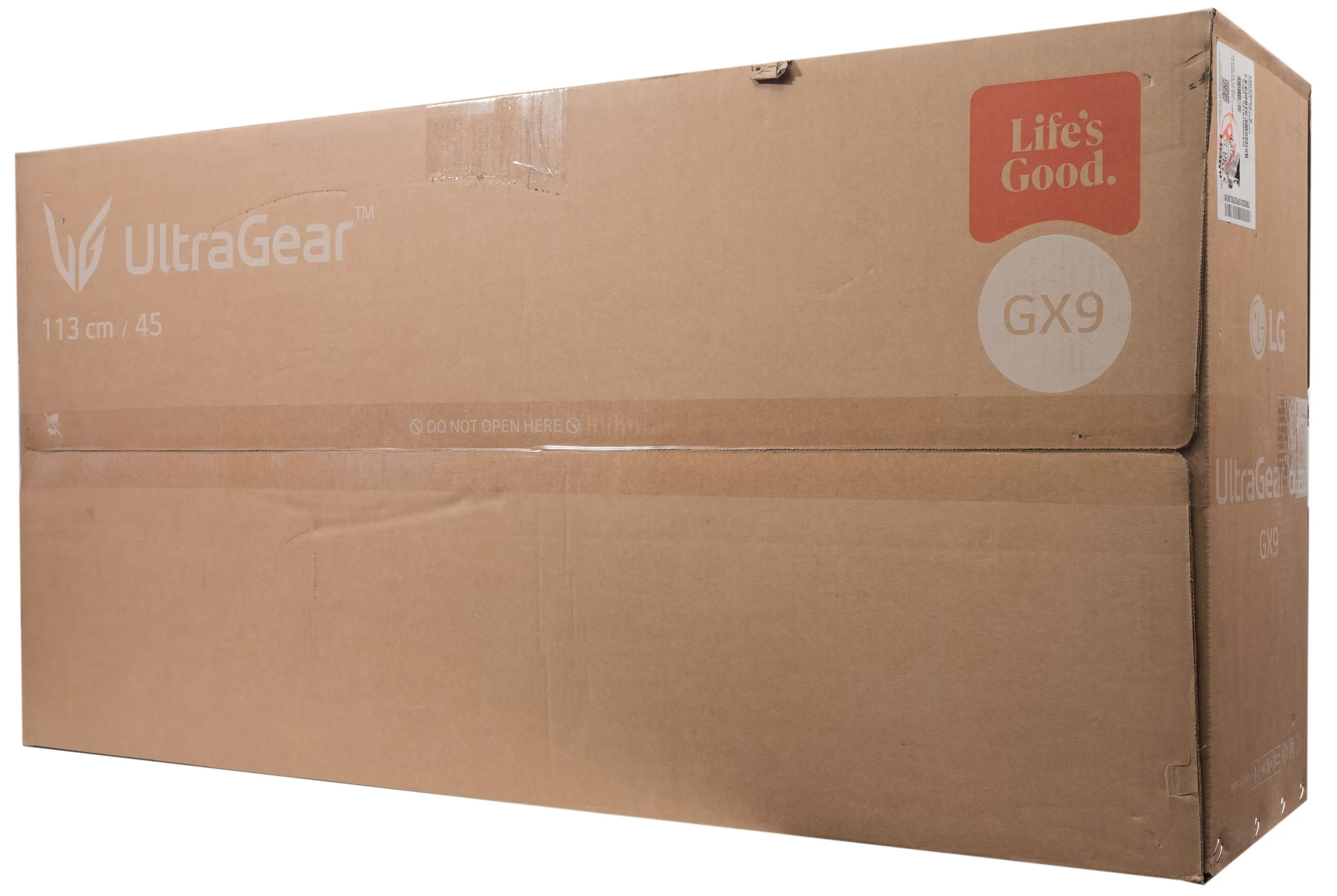 Монитор LG 45GX950A-B поставляется в очень крупной картонной коробке без особых визуальных изысков. Пластиковая ручка для переноски отсутствует, вместо неё по одному специальному вырезу с двух сторон. Вместе с упаковкой монитор весит почти 20 кг — для распаковки, сборки и установки не помешает «помощь друга».