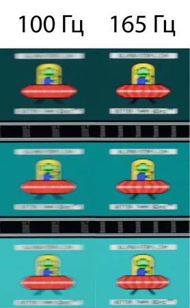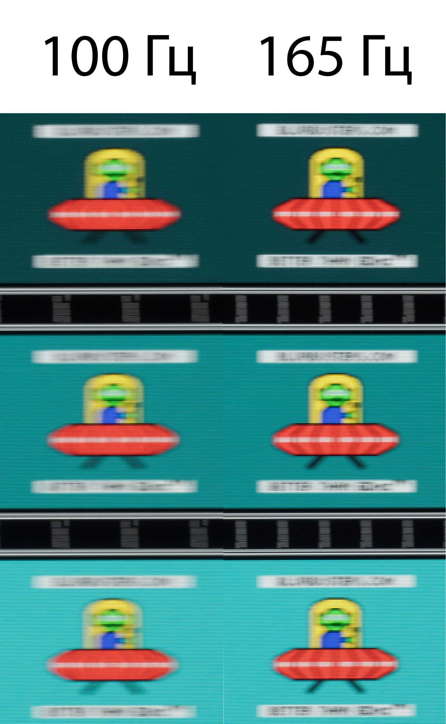 Дисплей демонстрирует минимальное смазывание и отсутствие визуально заметных артефактов. Повышение частоты с доступных в настройках драйвера 100 Гц до полноценных 165 Гц влечёт за собой улучшение плавности и четкости картинки, что наглядно продемонстрировано на сравнительном изображении выше.