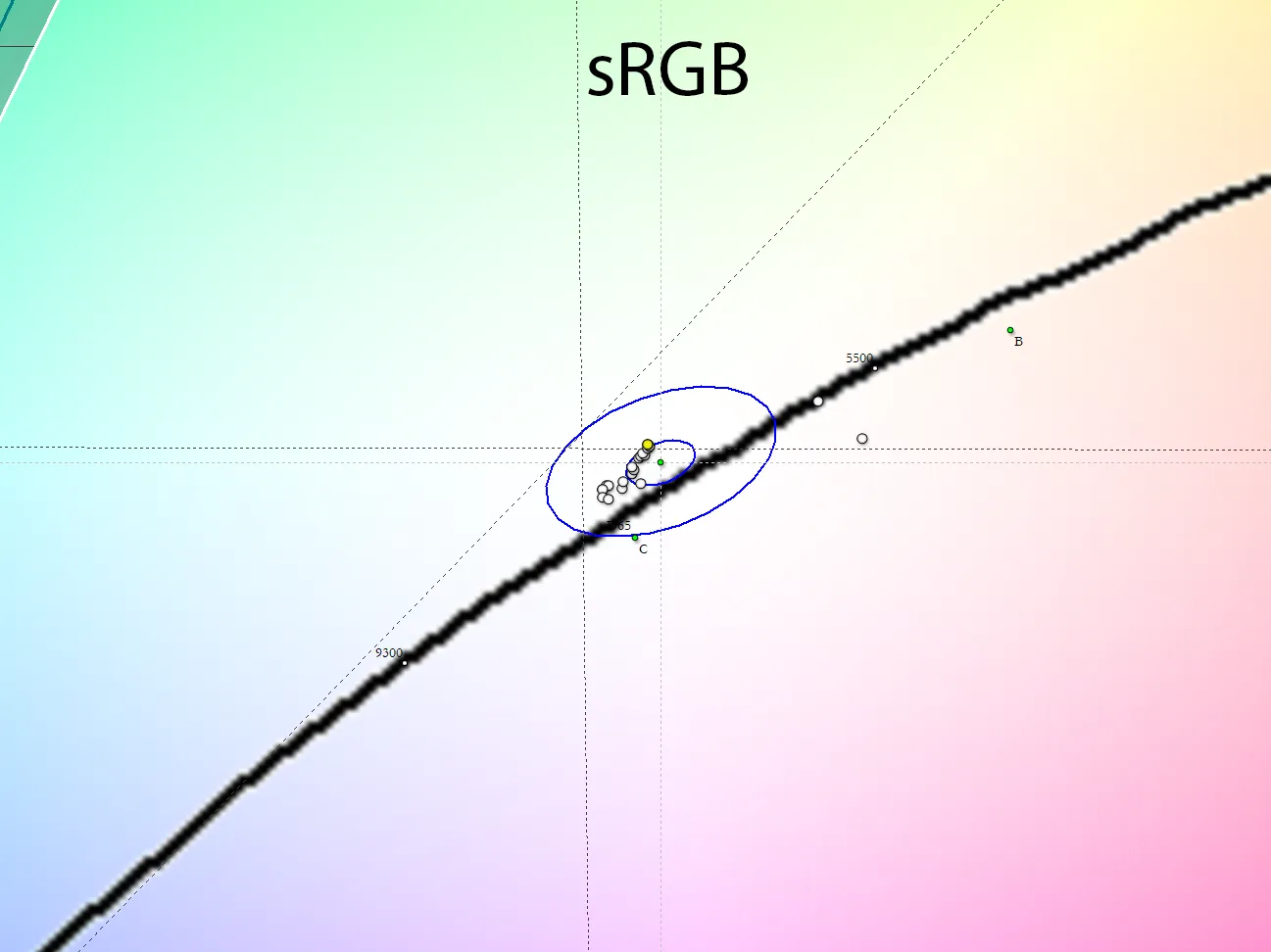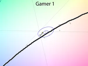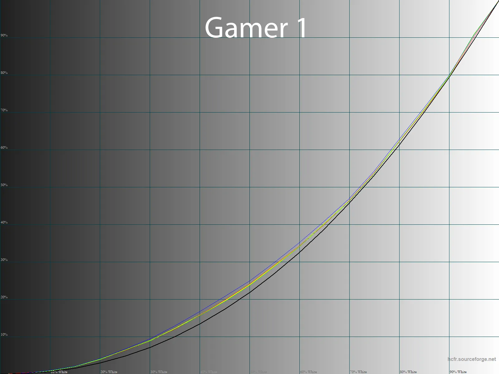Точка белого в двух основных режимах эмуляции приближена к референсу, в заводском Gamer 1 находится чуть дальше от него, а Reader продемонстрировал откровенно тёплую «картинку» на 5600 К.