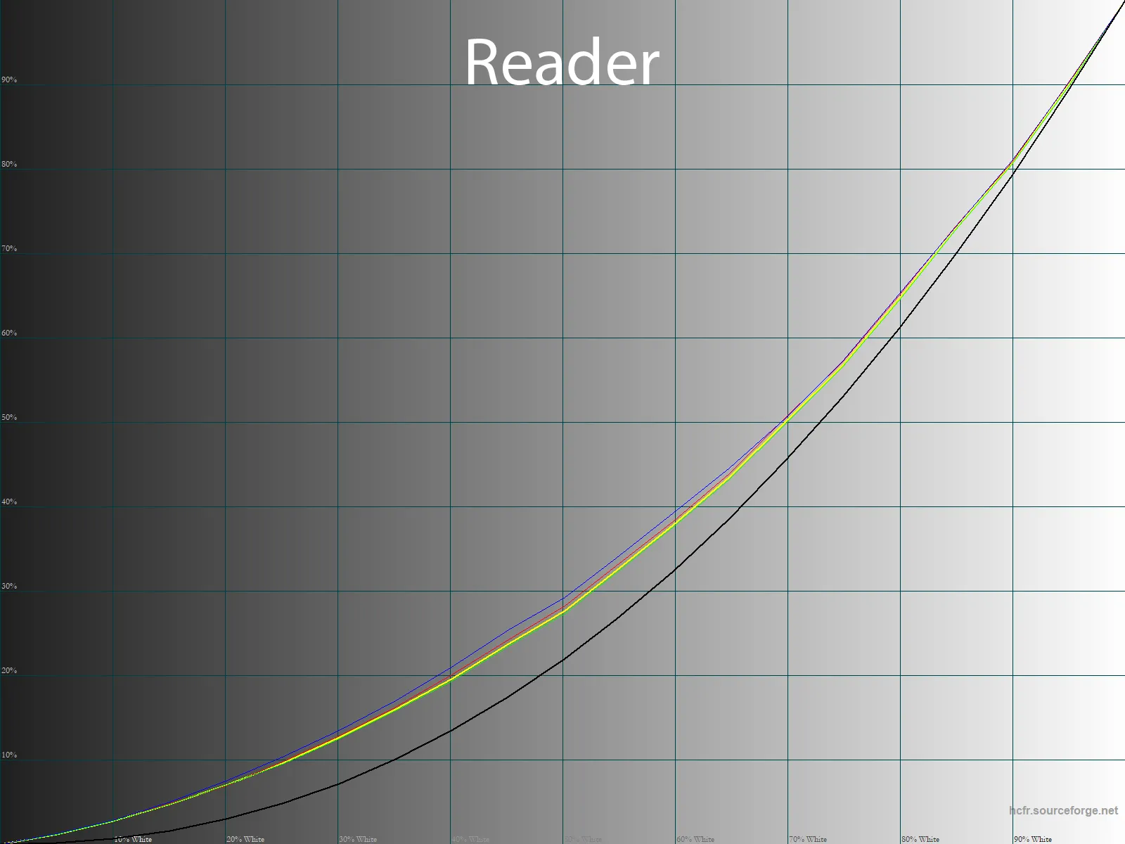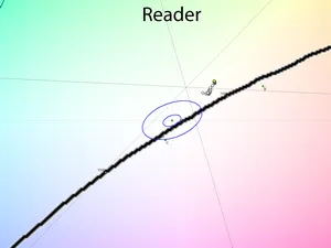 Переход к Reader приводит к тому, что точки перемещаются в «тёплую зону» с легким зеленоватым паразитным оттенком. Баланс ЦТ оттенков серого слегка ухудшается, а на гамма-кривых становится виден резкий подъём в глубоких и средних тенях, точка чёрного вместо абсолютного нуля добирается до 1.25 нит, чем снижает нагрузку на глаза при работе за монитором с низким уровнем внешнего освещения.
