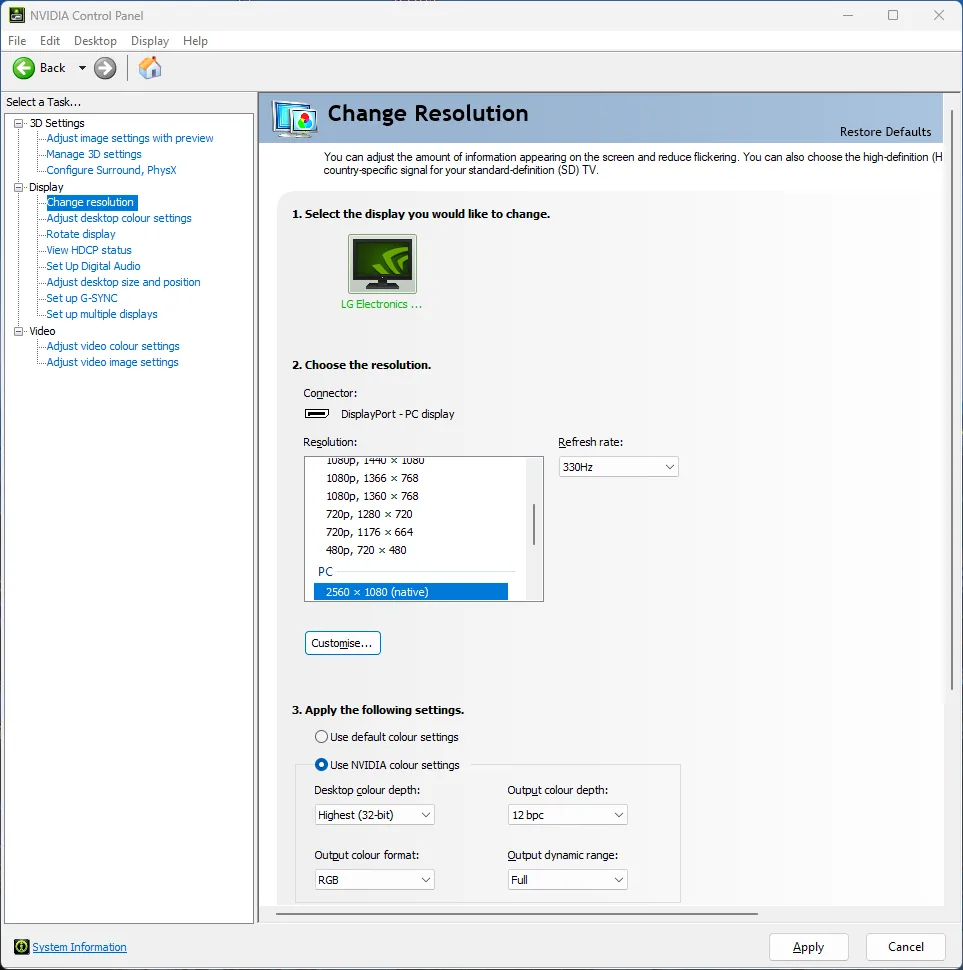 При использовании функции Dual-Mode с переходом к разрешениям 2560x1080 и 1920х1080 пикселей максимальная частота развёртки повышается до 330 Гц при тех же 12 битах на канал, однако, в дело вступает сильная интерполяция изображения — о высокой чёткости сразу можно забыть, вне зависимости от того, какой режим работы скалера выставлен в настройках дисплея.