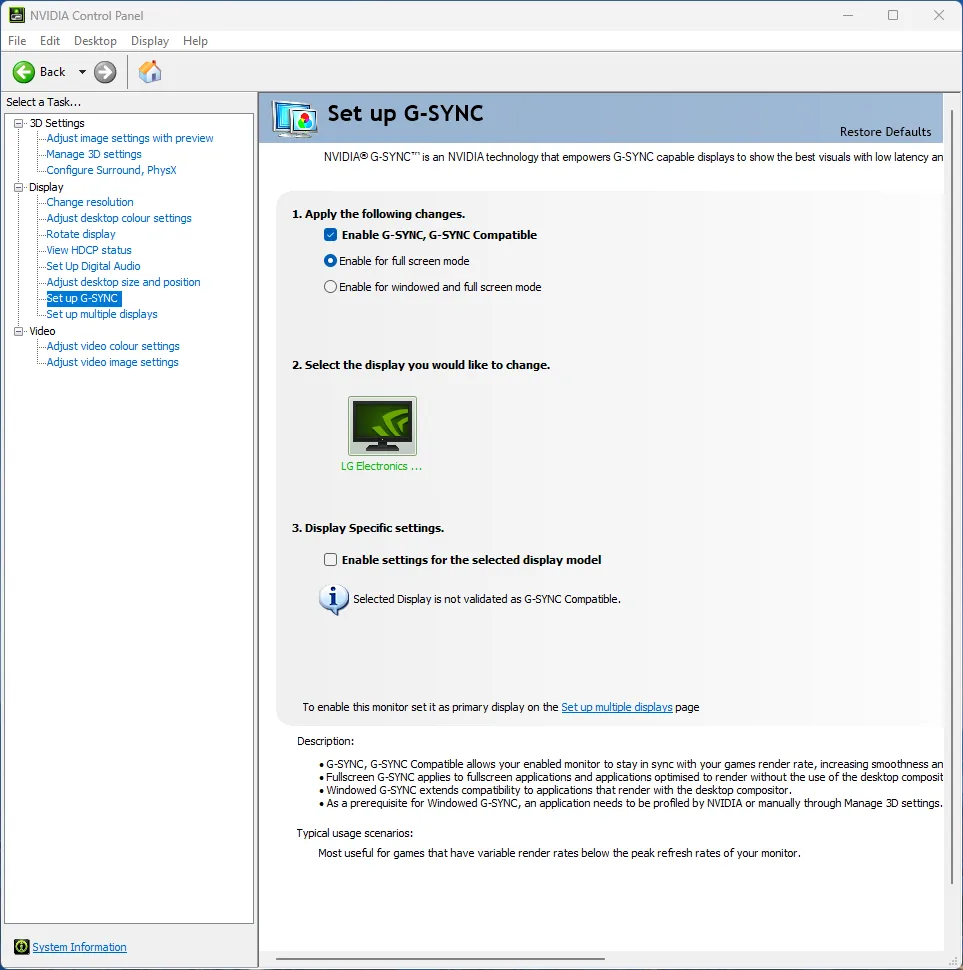 Монитор поддерживает все необходимые стандарты адаптивной синхронизации без использования какого-либо аппаратного модуля. Системы прекрасно работают в заявленном диапазоне частот, позволяя добиться отсутствия микролагов и разрывов картинки при сильно плавающем уровне fps. При этом возможно визуально различимое мерцание изображения в играх (особенно тёмных участков) при использовании любой из систем, но такова особенность работы практически всех OLED-дисплеев, как без использования дополнительных функций, так и с ними (как например, Anti-Flicker у ASUS и нечто похожее у Samsung).