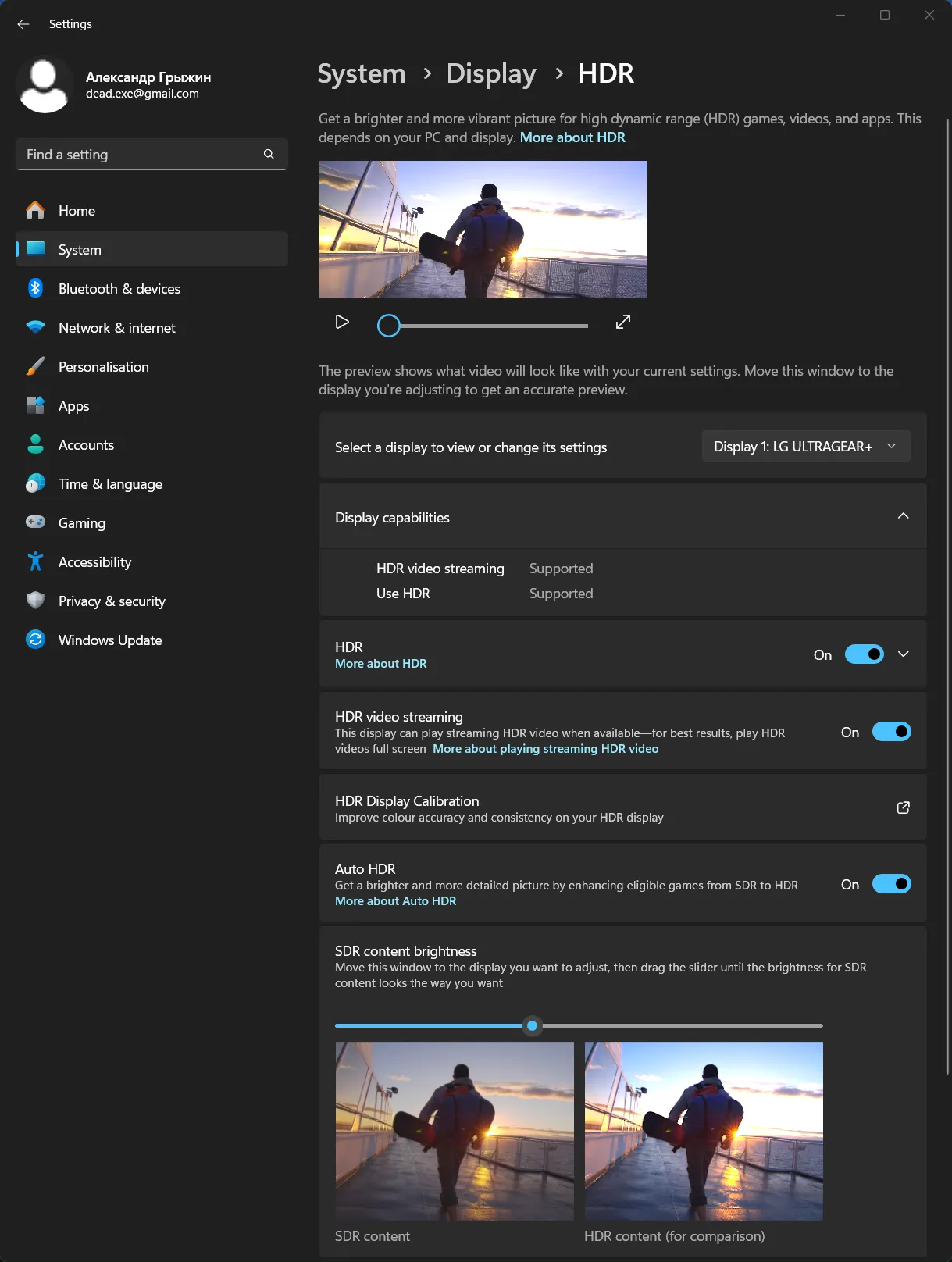 Пиксель у 45GX950A-B, как и у любых актуальных W-OLED-решений, формируется четырьмя субпикселями (белым, синим, зелёным, красным) вместо классической схемы RGB. Для органических матриц LG Display — это стандартная компоновка. Белый субпиксель внедрён для повышения яркости матрицы. Но даже в этом случае, номинальная яркость в режиме SDR не превышает по заявлению производителя 275 нит при выводе белого поля на весь экран. При выключении функции стабилизации яркости по всему экрану можно получить порядка 600 нит в небольшой зоне при работе с SDR-контентом, а при включении HDR нам обещают до 1300 нит в пике в зависимости при заполнении экрана на небольшие 1,5% APL.