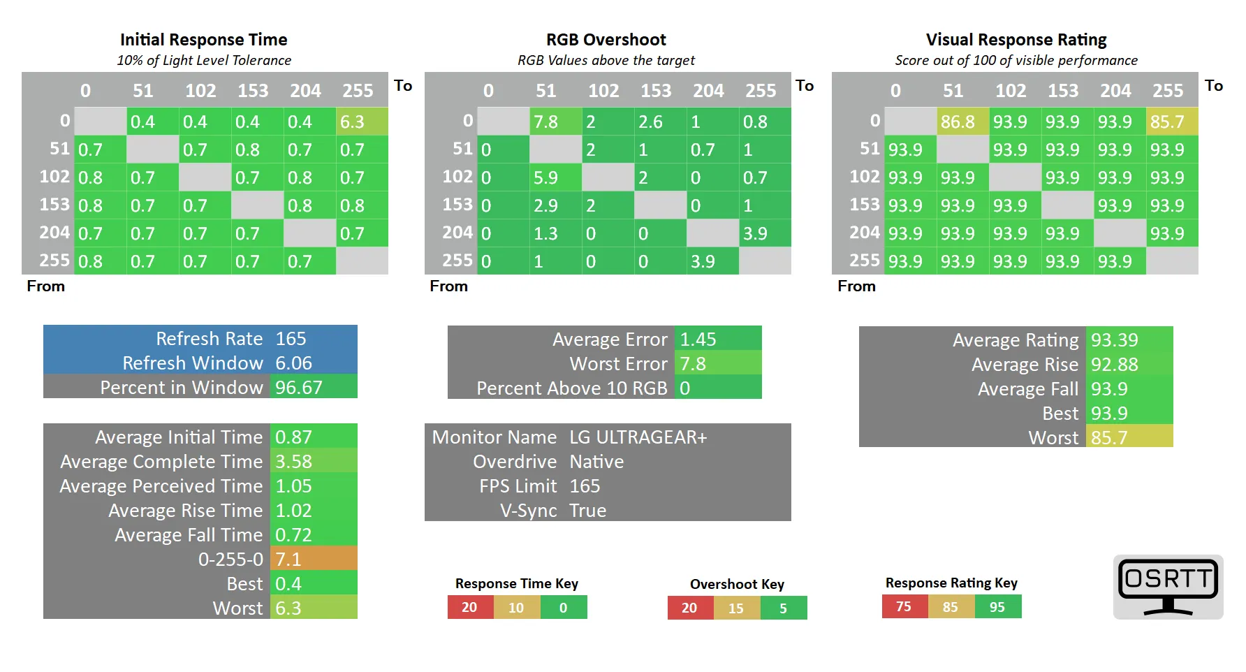 В ходе тестирования аппаратно-программным комплексом OSRTT мы проверили работу монитора лишь на максимальной частоте в 165 Гц для нативного разрешения экрана. В этом случае среднее время отклика не превысило 0,87 мс, а самый быстрый переход GtG произошёл за 0,4 мс. Очень слабые артефакты есть на цифрах, но зрительно мы с ними не столкнулись – сделать этого не сможете и вы.